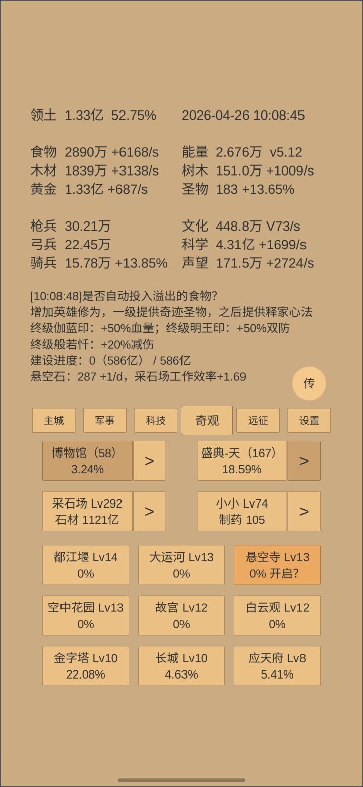随便玩了很久,需要大佬们指点1,酒坊升多少级合适,什么酒收益高,还是均衡就好?2,篝火问题同上。3,圣物是什么意思,怎么用,上次用完黄金收入降低了好像就没用过了。4,跃迁也没用过,不太懂。5,药园升多少级合适?6,兵事堂是不是要先解锁任务,但是要90亿黄金,觉得很贵,紧急任务只增加铜质勋章吗,好像消耗贡品,收益值吗?7,三个英雄升多少级,什么爵位合适?8,神器没鉴定过好像,收益大吗