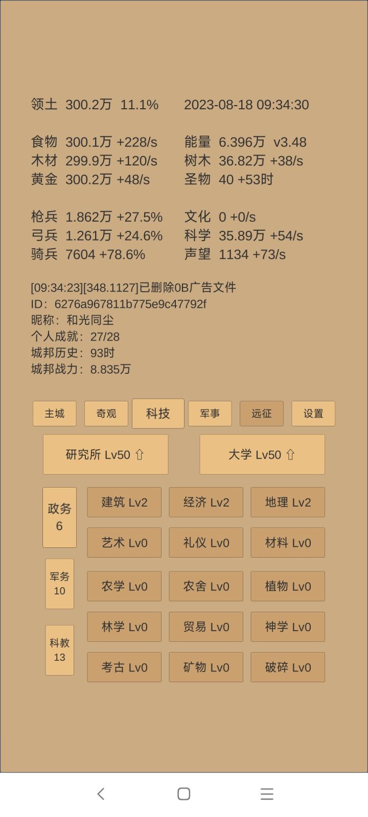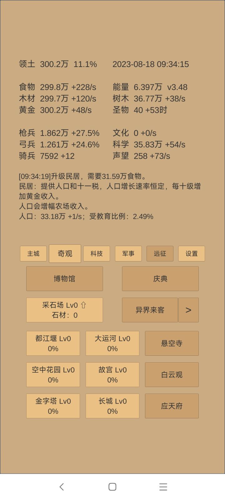 这个阶段已经很慢了,基本就是靠慢慢磨。797.1万战力了,怕掉跃迁所以现在不敢出骑和开地典,就升博物馆。计划55博物馆升食物奇观12,60升13,65升14,70升15的比例。现在已经在攒奇观了,估计这波升完就要掉跃迁了,到时候再开地典。食物奇观升三个,木头升两个,黄金升一个。再打10层道境,人文物理数学各升一级。英雄二转还早,丹上限应该能吃到31。在升聚灵阵,冲3士气。百济按现在的进度要40