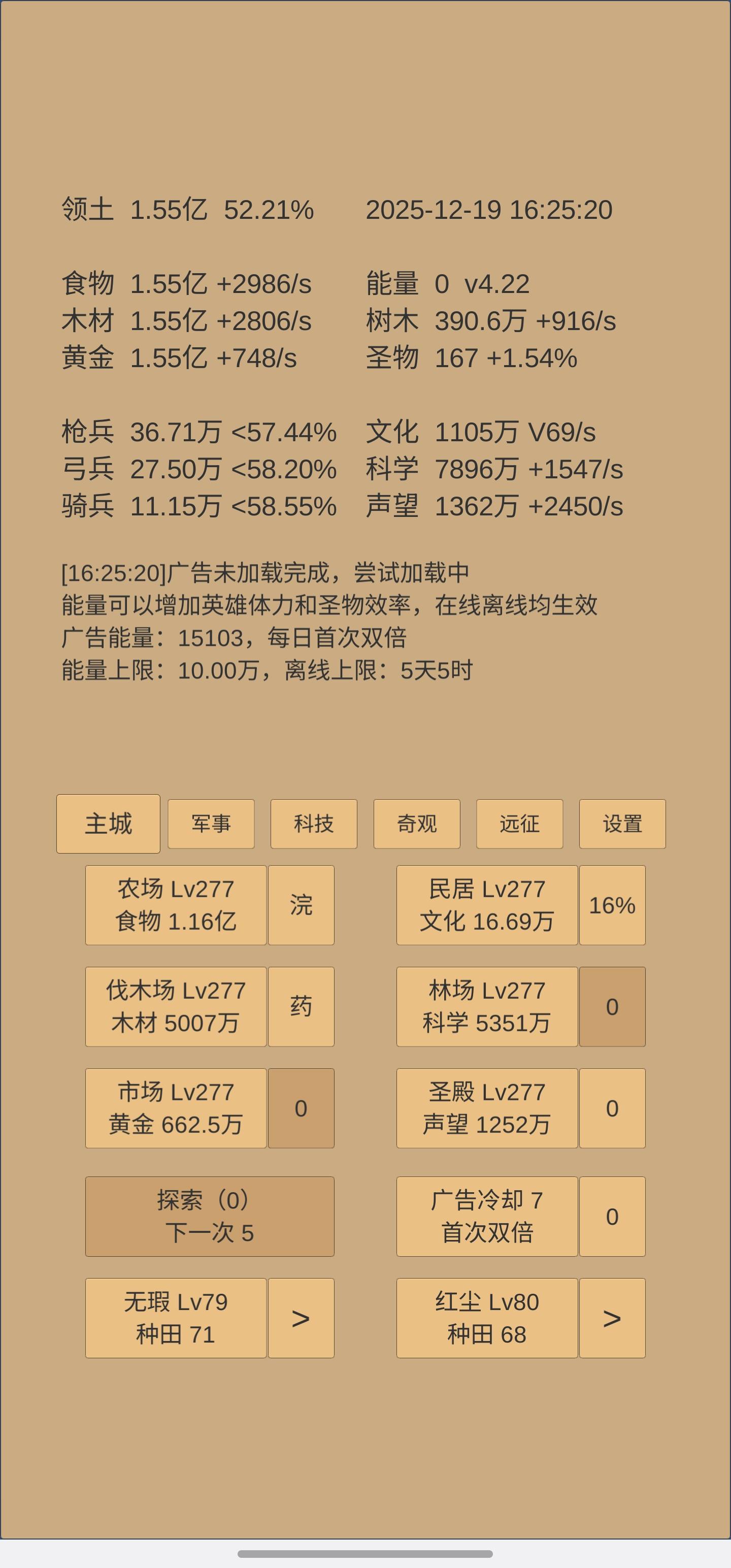 下一步,聚灵阵继续缓慢跟进等级,保证灵气接近存满4亿阈值,直到小小和无暇都有20丹后暂停升级。司命仍然用破军,马上要升级了,还差3天时间,三个上古阵图也都研究,让司命升级速度拉满(聚灵阵灵气存满也是为了这边扣除消耗)。奇观三行都在升武学,博物馆升1级后继续开人典加速英雄升级转世,但也要和灵丹获取进度相适应,争取灵丹喂满后8天内即可转世。科技升艺术到48,建筑到48,物理升到不可升为止,多余的科