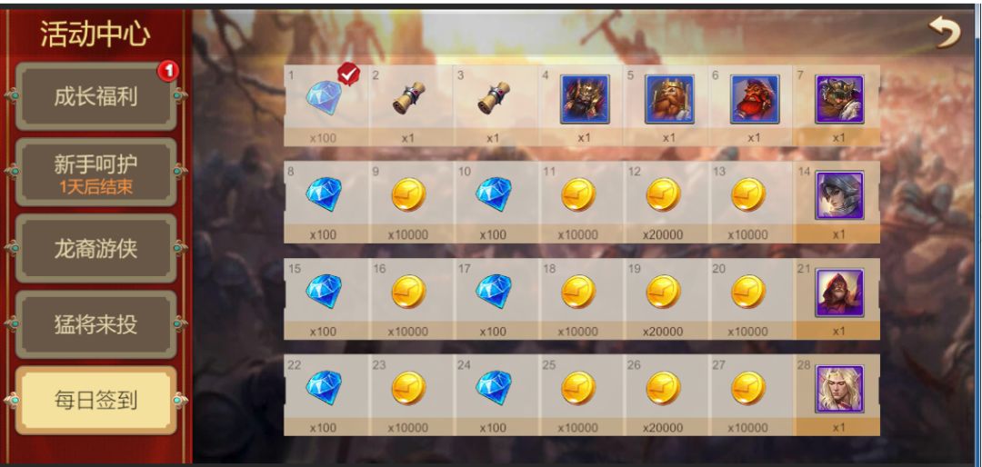 一、每日签到-活动中心 连续奖励2个十抽卷轴, 4个5星英雄 二、成长福利-活动中心 只有势力值要求,其中累计招募令五十个 三、日常任务 每日可领五十钻石 四、竞技场 提升排名奖励大量钻石,每日结算奖励钻石,首日奖励足够十连抽 五、每日试炼 通关奖励大量钻石和资源 六、开荒补助 新手期及时补充英雄和技能 七、常规进度福利 任务 赛季进度 首占城池 赛季结算 八、招募福利 请注意是每第十次必出5星,