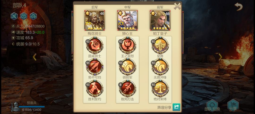 战斗规则 ●战斗由准备阶段和最多8个正式回合组合 ●后军或者全体兵力降为0的一方失败 ●战平时,地块守军不恢复兵力 ●英雄重伤时额外损失大量伤兵 ●部队回到建筑时,恢复全部伤兵 ●战斗后地块下降的耐久值等于部队攻城值 ●地块耐久降至0时被占领 ●主城堡被攻破即被俘虏 ●分城堡被攻破变为废墟,残留部分城建等级 ●地块耐久未达上限时每小时回复2% ●公共设施守军(据点、要塞、金库、城池)、叛军、流寇兵