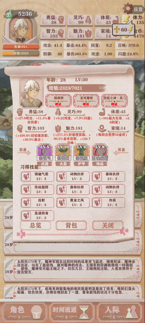 10岁后面每回合两次攀岩、酒馆喝酒吃饭、四次狩猎、老婆好感度,还有体力留20进图然后看分配大本营15体打工或者35体搬东西打工或者山泉40体换2魅力