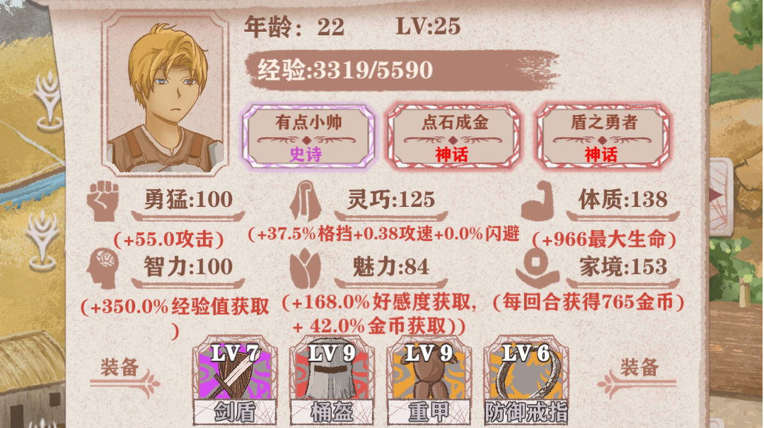 玩法思路就是靠钓鱼为经济来源,开局先看书,争取打怪前把十点隐藏智力拿到,然后第一关里想办法把灵巧升到30,魅力升到20,盾勇的话主玩反击流,堆防御格挡反击生命,生命恢复的话不用刻意堆。之后就可以刷刷刷了,每天大概就是在家锻炼一次体质或者灵巧,然后去酒馆喝一次酒,再去钓三次鱼,跟女剑客刷次好感,再去教堂跟修女刷一次好感或者打工一次,最后去打怪,每天循环即可。有地买地,有神器买神器。