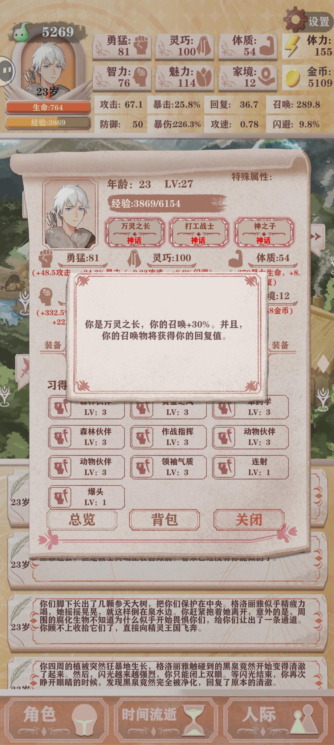 天赋是狩猎之王、弓之勇者、勇敢的心 主要是狩猎之王捞钱,前期密林出来后一回合就可以买鸟,第二回合就可以买怀表,中期升一点灵巧可以让你基本次次狩猎有史诗传说,主要属性就升勇猛和智力,打怪可以用20体力的,把商店买空后也可以走很远,省下体力用来锻炼,有钱可以多买圣遗物,每回合都要记得打怪,前期不要拿献祭中后期再拿,反正可以升到30多级后面总会碰到的。