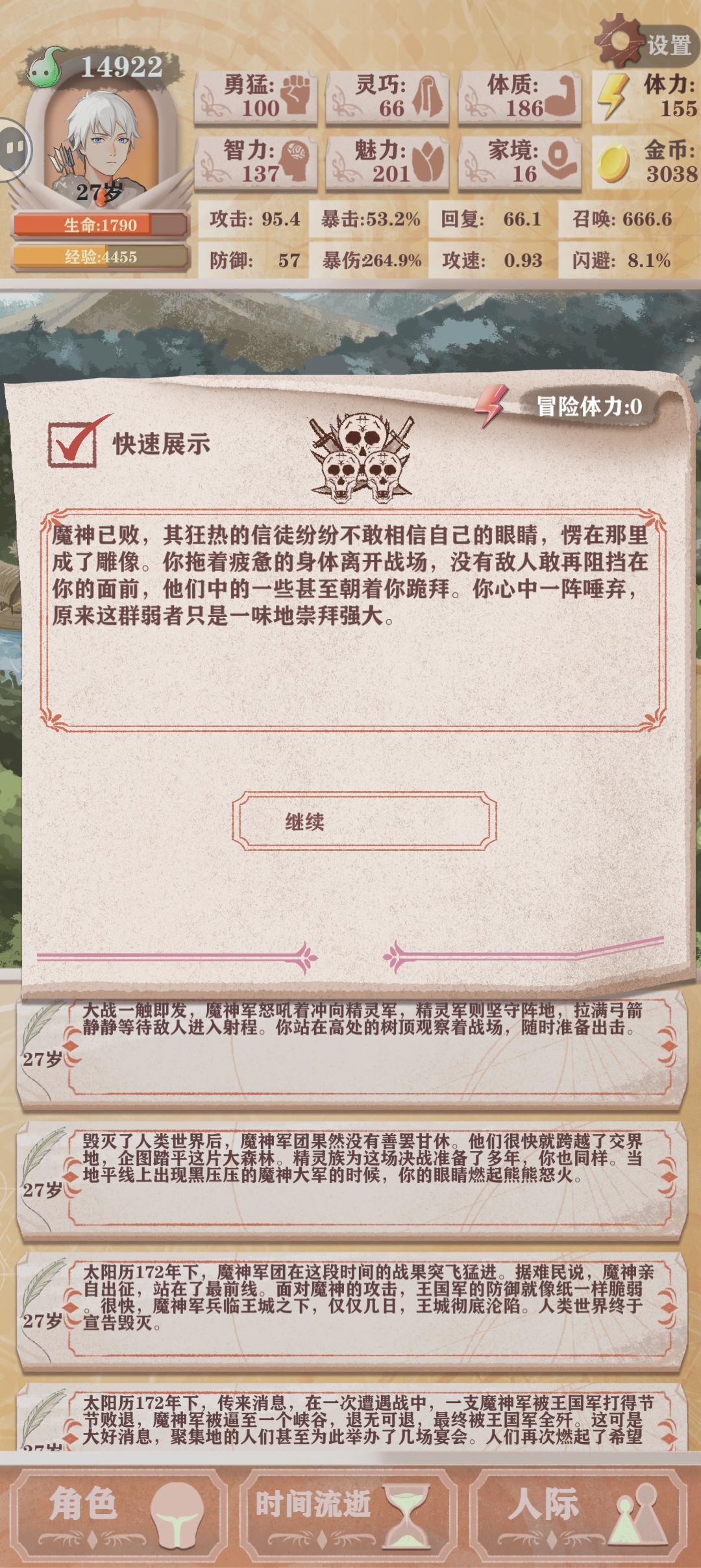 猎人残10和残11是一个非常难受的时间段,一刀砍不死,闪避流又慢又坐牢,脸黑还可能打不过,一刀闪避流也难打图4图5深处,那么只有召唤了。 看图说话,195智力,325魅力,面板就1000+召唤值了,而且装备才两个8级红,还有两个8级橙,并不算顶级,打魔王全程无伤,一次没被碰到。 说说攻略,1岁4智力事件,6岁以前无脑智力,山泉开了到10岁期间,每回合留足够体力给山泉小动物,剩下全智力,女一要去碰一