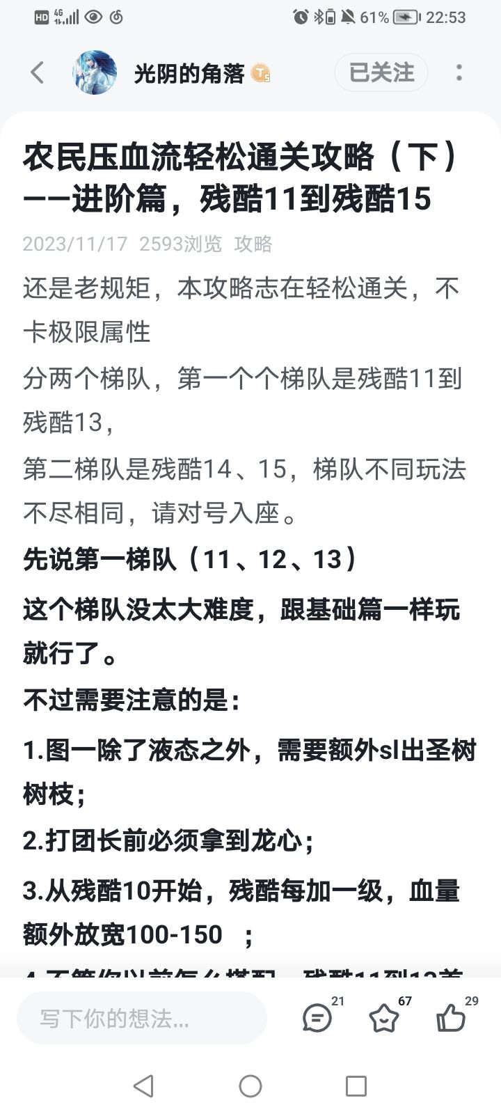 为什么选择6到15?因为这一阶段可以锁定2天赋,更容易拿到固定搭配,流派可以发挥威力。 农民,残酷6到11可以压血,也可以血牛(邪健打最好)压血可以看光阴的角落的攻略。残酷12到15推荐血牛,可以看Jeune的攻略(这攻略天赋一换成邪健打就能打低残,所以说血牛才是农民的版本答案啊)。当然我血牛的经验和他不同,可以看我别的帖子。 猎人,残酷6到8适合光阴的角落的攻速暴击流,推图巨爽。但是以我的经验