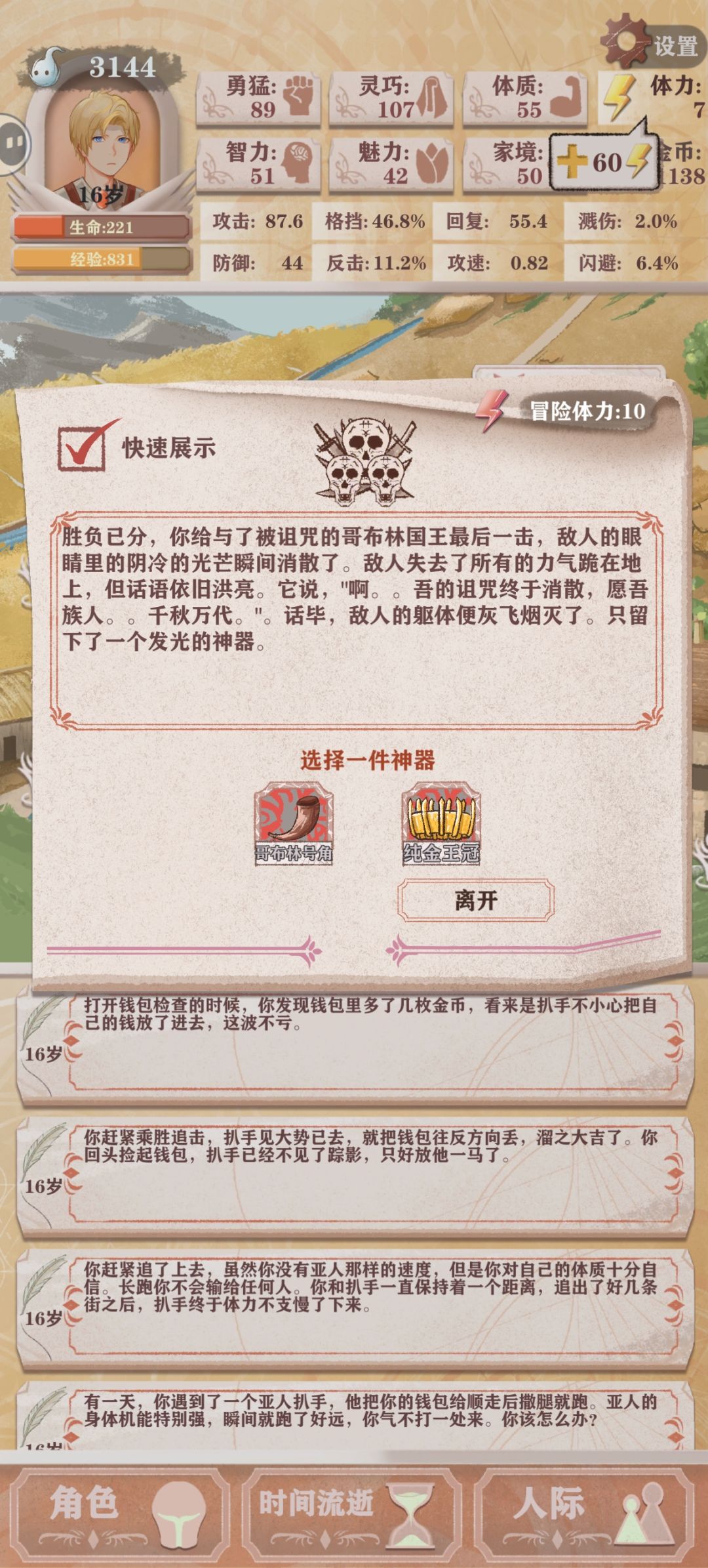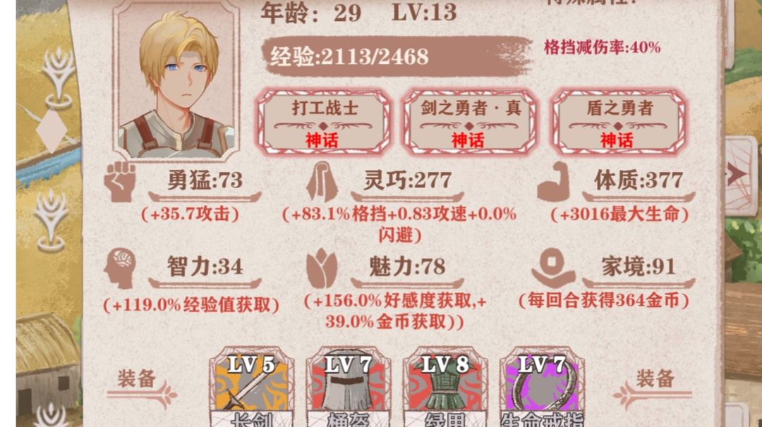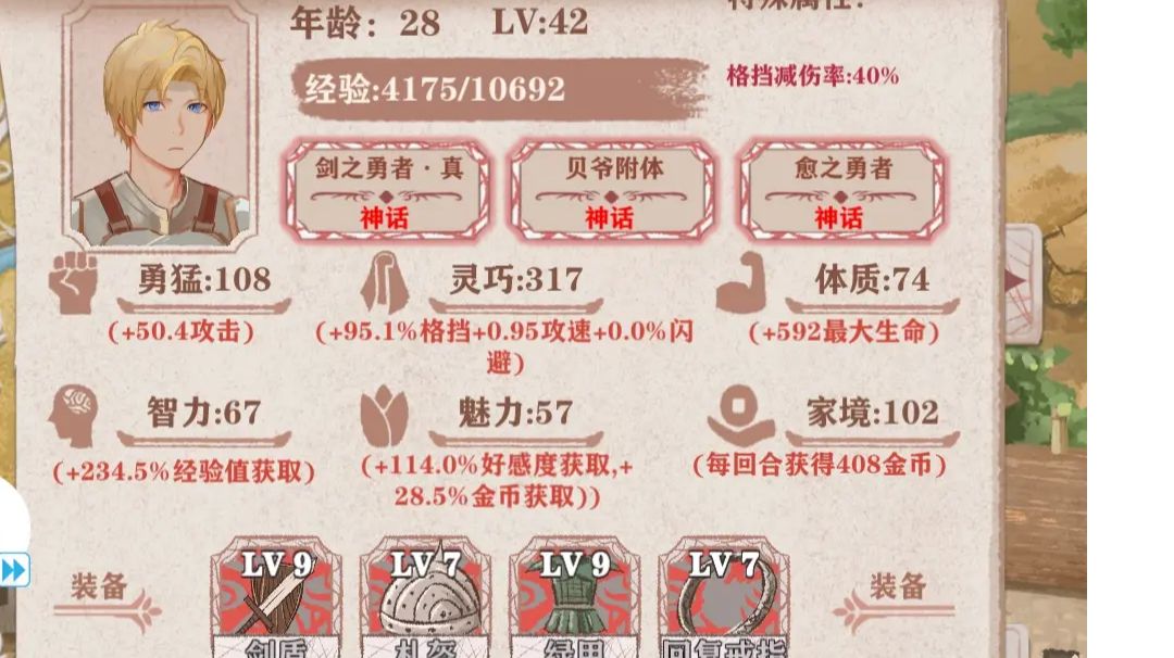 注意:十岁前不钓鱼不读书不跟小孩儿玩(丰收季除外),低环开局先拿尖刺甲或愤怒盾二选一,体力光环必点3a+1 全程只需要sl三回,十岁前防守事件,魔王前一次兽人图七级装备,削减恶兆事件 天赋推荐:盾勇,打工,真剑 核心遗物:尖刺甲,愤怒盾,黄金套 重要遗物:巨人腰带,免疫宝石,巨人之血,血魔头盔,不灭之凯 次要遗物:收割者,攻速披风 boss遗物:哥布林王冠,牛角,噬魂,龙心,王国圣剑,精灵权杖,毒