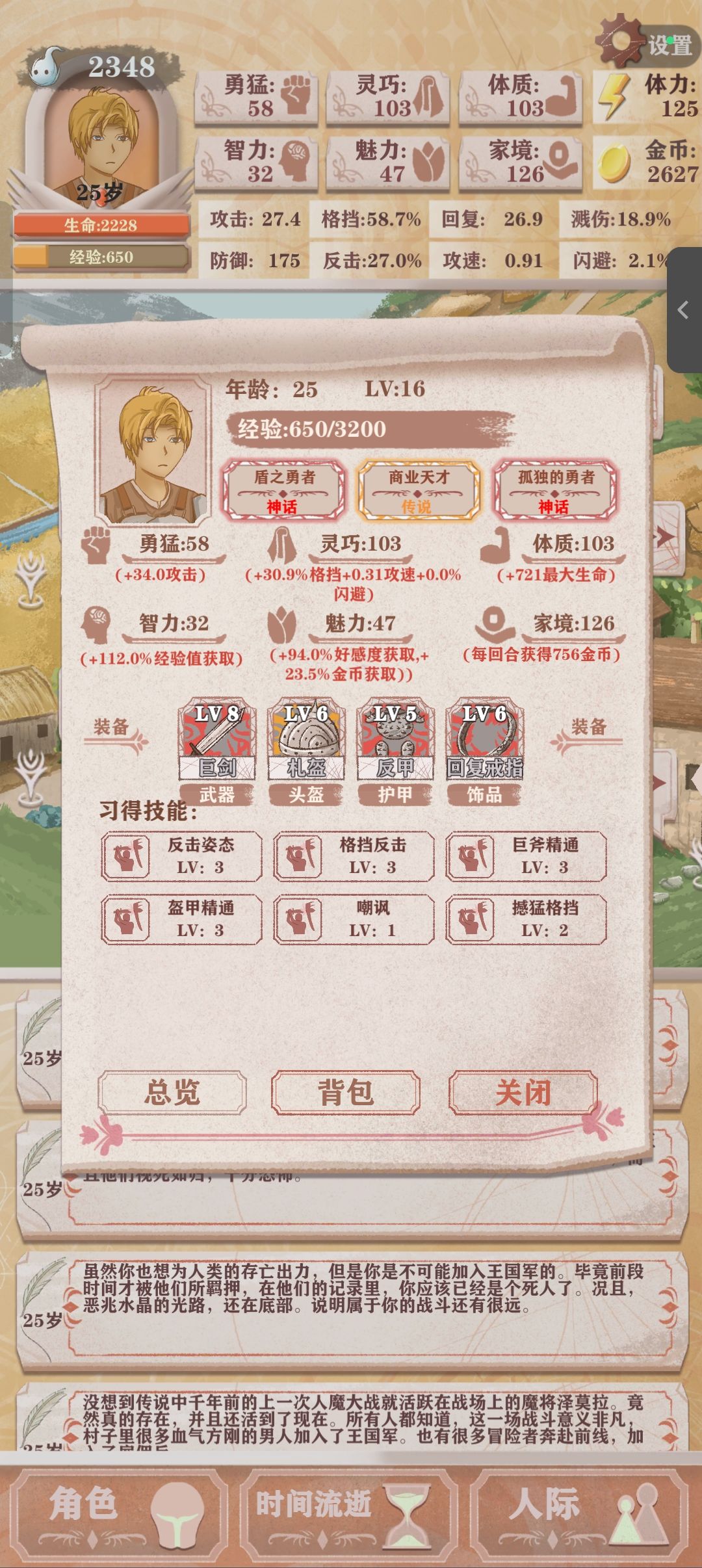开局选盾勇,天赋首选反击姿态,格挡反击,次选盔甲精通,嘲讽,遗物优选岩石铠甲,荆棘吊坠,愤怒之盾,巨人之血,尖刺铠甲,血魔之盔,打败龙王和蜘蛛选龙之心和毒腺,剧情打败神父选噬魂,冒险宝箱有树种就选,装备优选有防御有格挡。游戏营运方面,刚开始冒险宝箱有金币选金币,金币和遗物有用的就选遗物,魅力很重要,后期开酒馆会用到,魅力20之后可以当调酒师,10岁开始必去酒馆吃饭和果汁,然后锻炼(优选体质)耐力到