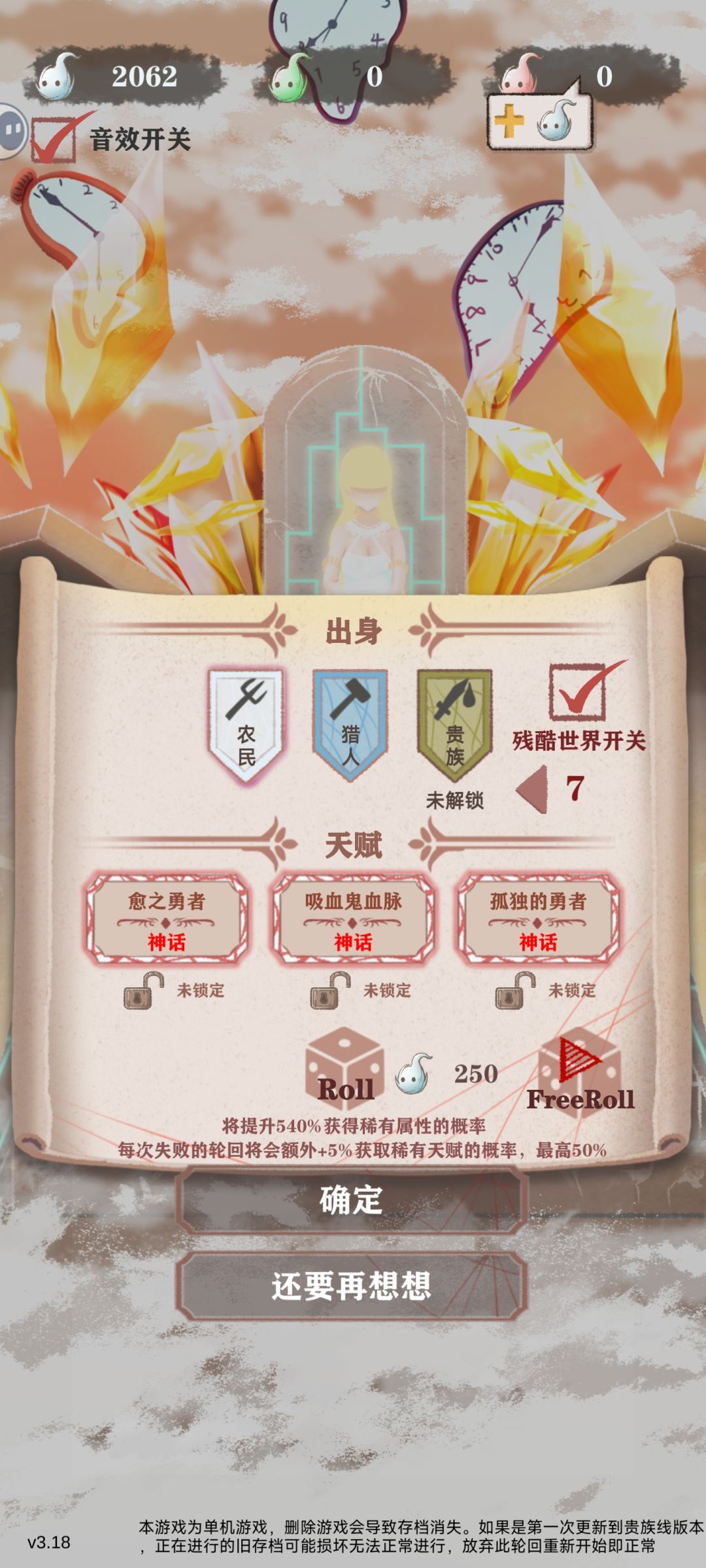 开荒老是打不过为什么?那肯定是你没有一套好的开局天赋。成品大概5分钟一个3红天赋 开局我们只要先看5次广告,然后备份数据。就可以快速so出3红开局,极大降低开局难度。如下 那么没有好天赋能不能一次通关,本次挑战最费天赋开局没有之一。天赋如下 1-7岁我们目标是读书把10智力奖励拿了,需要读5本不加智力的书。需要so一下,6岁剧情我们选择不去地下室。(这次运气不错刷出了3家境剧情)极限的话还