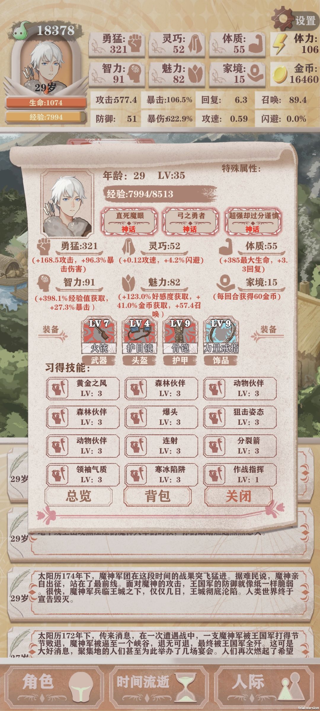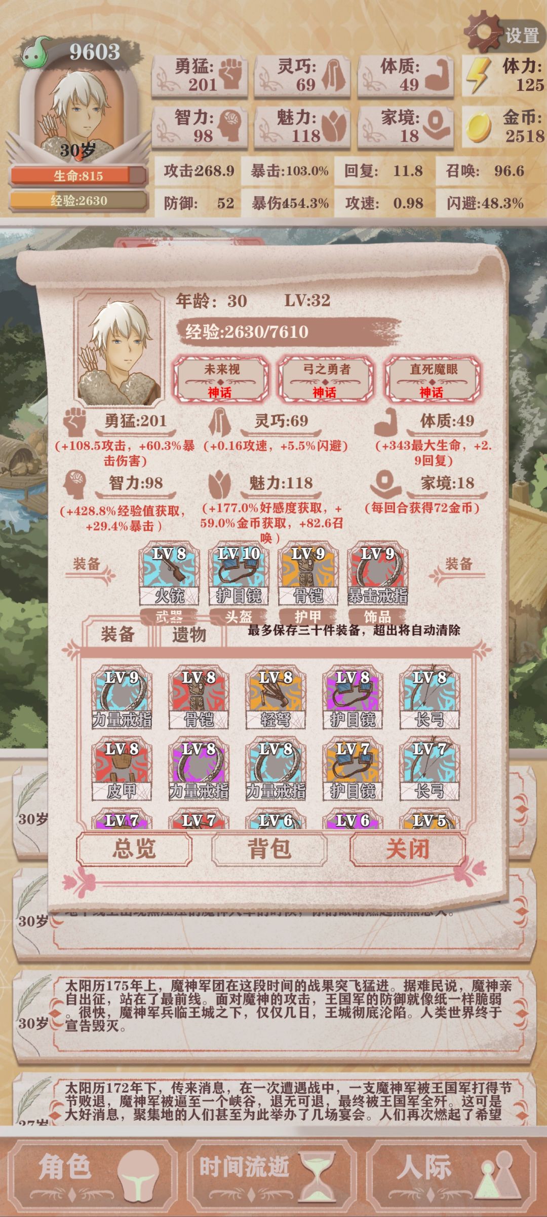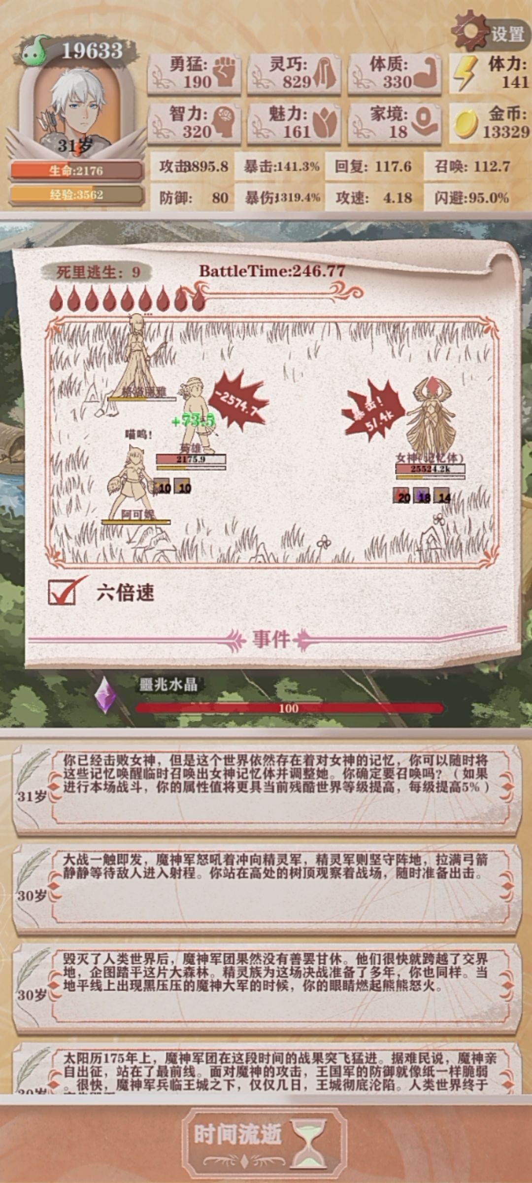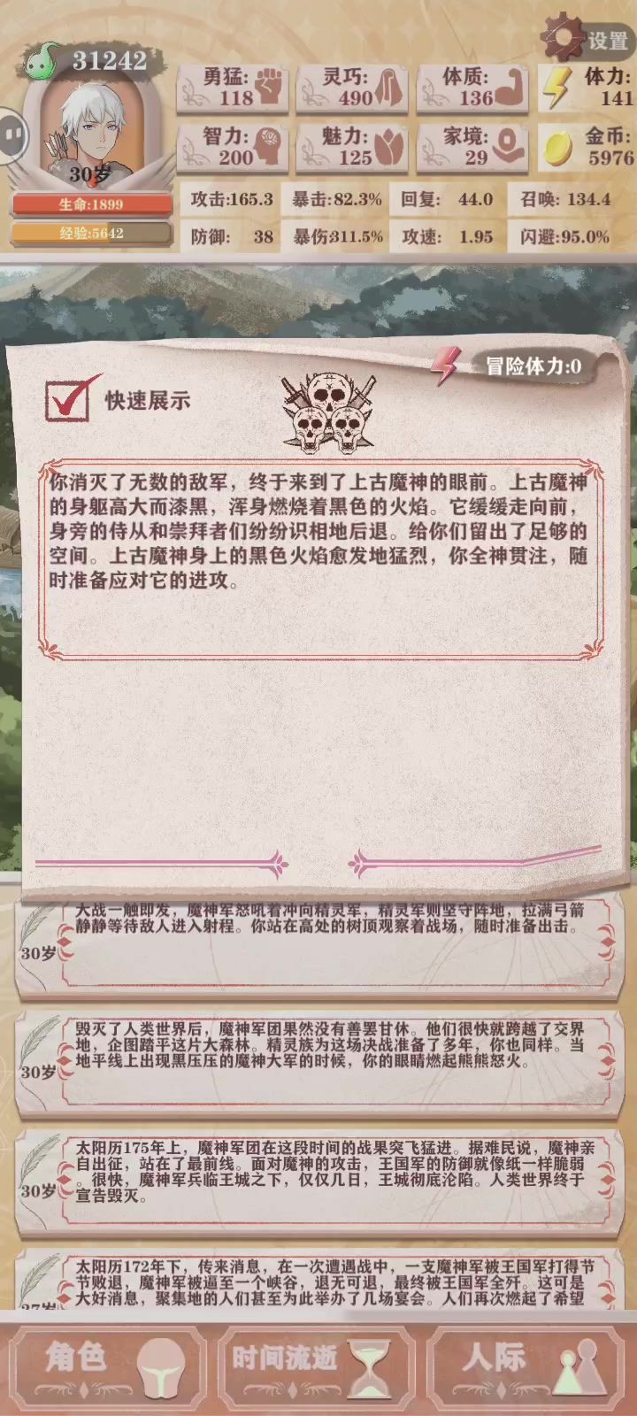 猎人残10和残11是一个非常难受的时间段,一刀砍不死,闪避流又慢又坐牢,脸黑还可能打不过,一刀闪避流也难打图4图5深处,那么只有召唤了。 看图说话,195智力,325魅力,面板就1000+召唤值了,而且装备才两个8级红,还有两个8级橙,并不算顶级,打魔王全程无伤,一次没被碰到。 说说攻略,1岁4智力事件,6岁以前无脑智力,山泉开了到10岁期间,每回合留足够体力给山泉小动物,剩下全智力,女一要去碰一