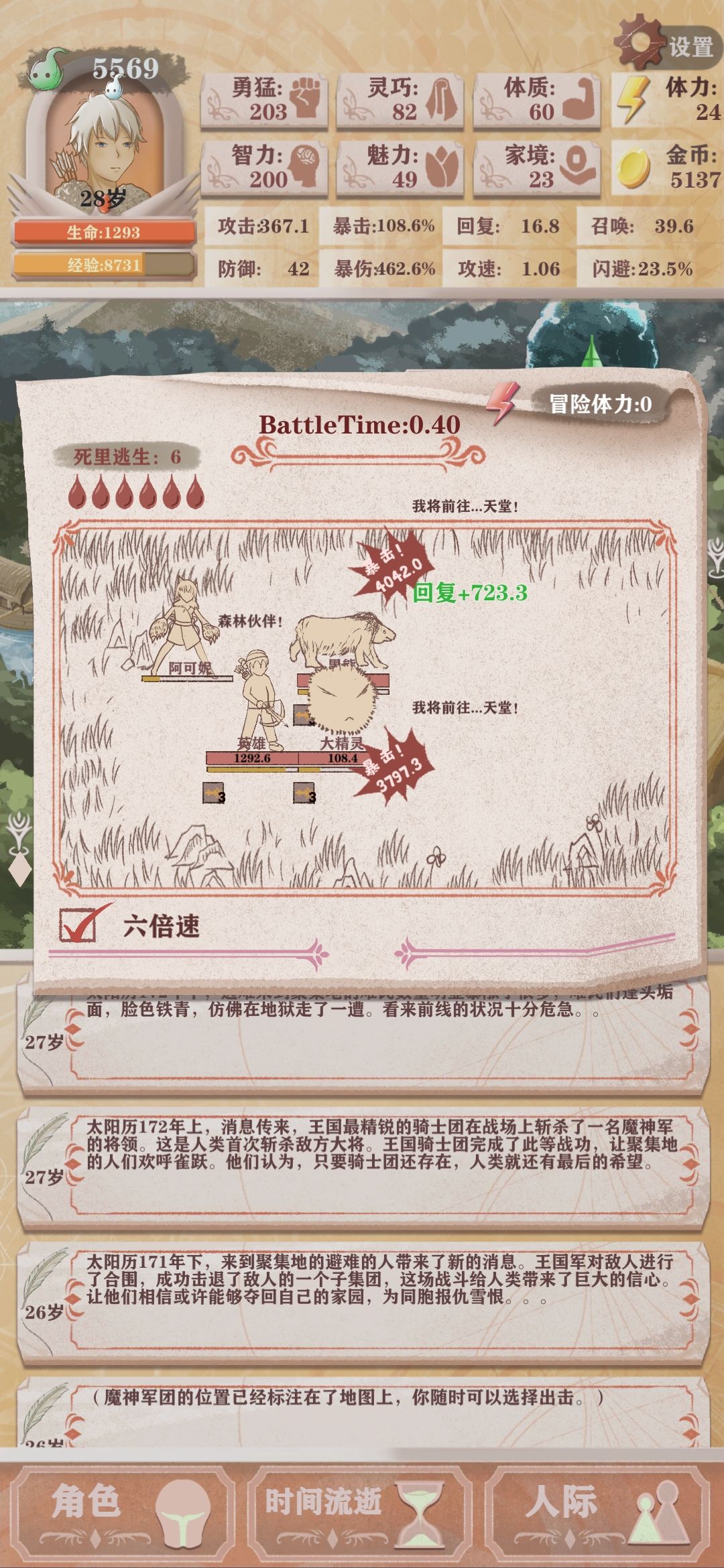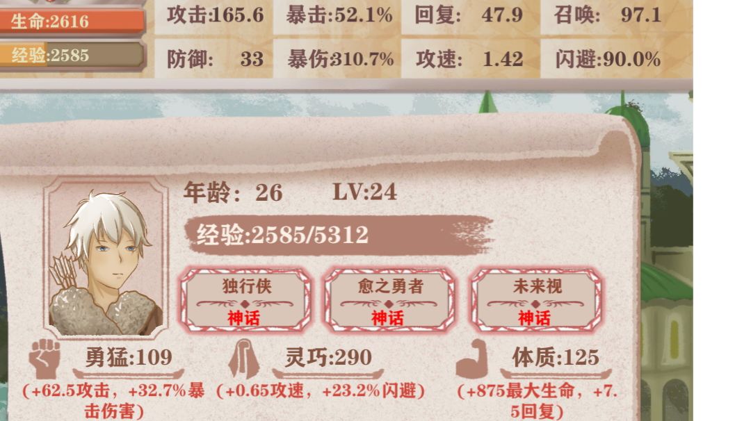 首先放上作者透露的实机截图 大家都看到了 格挡反击换成了暴击爆伤 溅伤换成了召唤 其他不变 首先说召唤,有两种可能,一种是召唤的概率(我觉得可能性不大),另一种是召唤物是每次战斗固有的,召唤数值代表召唤物的强度 通过下面的文字可以看出,猎人现在10岁,父亲给了他一个召唤狼的道具,从而开始冒险 农民线也是10岁开始冒险的,不管是地下室还是神秘男给装备都是10岁才能冒险 所以猎人线很大可能是每次战斗都