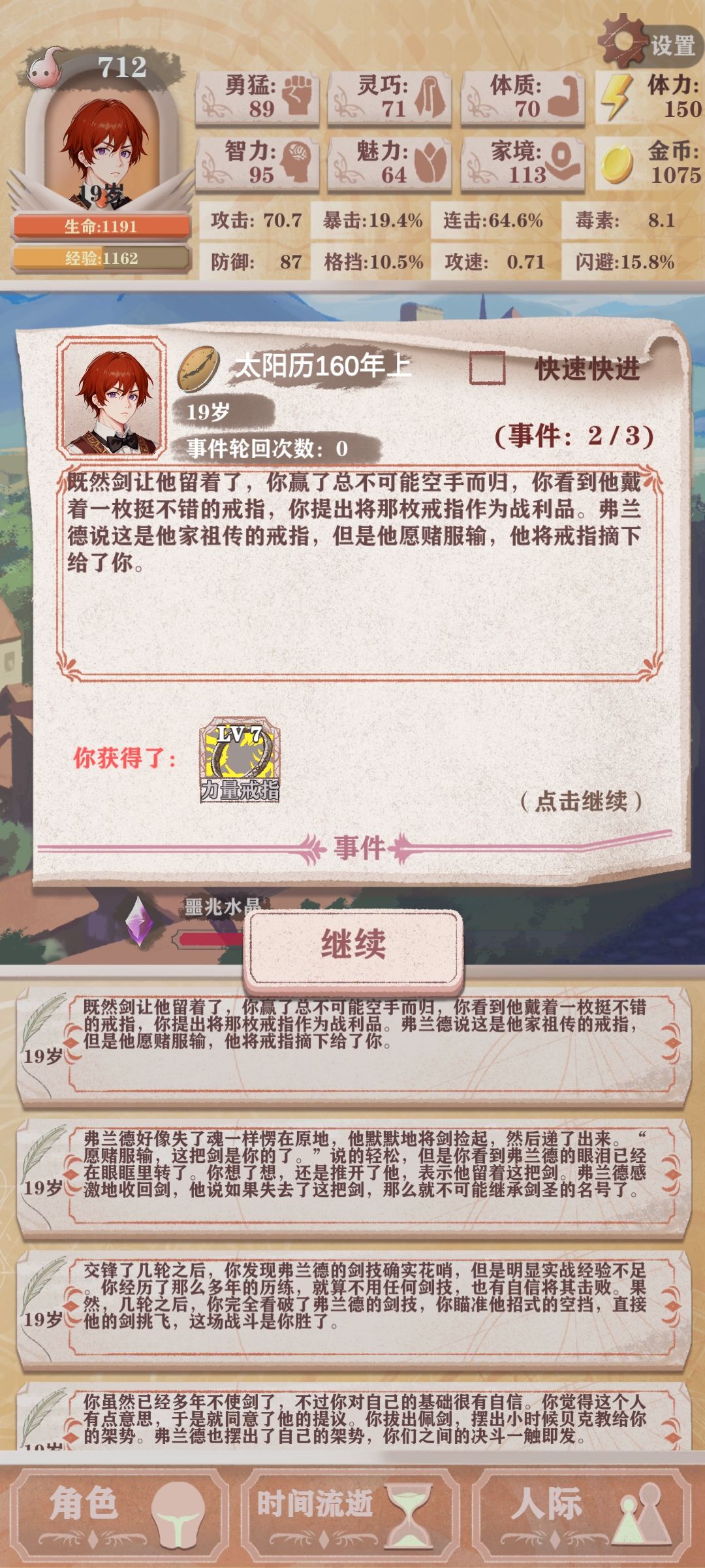 一岁,睡觉有概率智力+4 3岁,黄色光球,需要10灵巧,奖励3体质 6岁,山泉,绿色~回复;蓝色~闪避;红色果实~暴击 8岁,改良滑轮组,需要16智力,奖励父亲好感20,家境3 7岁,独角兽,需要16体质,奖励3魅力,2体力换+1装备概率 10岁,狼事件,驯服-狼笛,击败需要勇猛25-两次必然闪避。开放冒险,聚集地甜甜圈事件,需要100金币,加阿可妮好感。开放餐馆,20块20体力,150块,50体