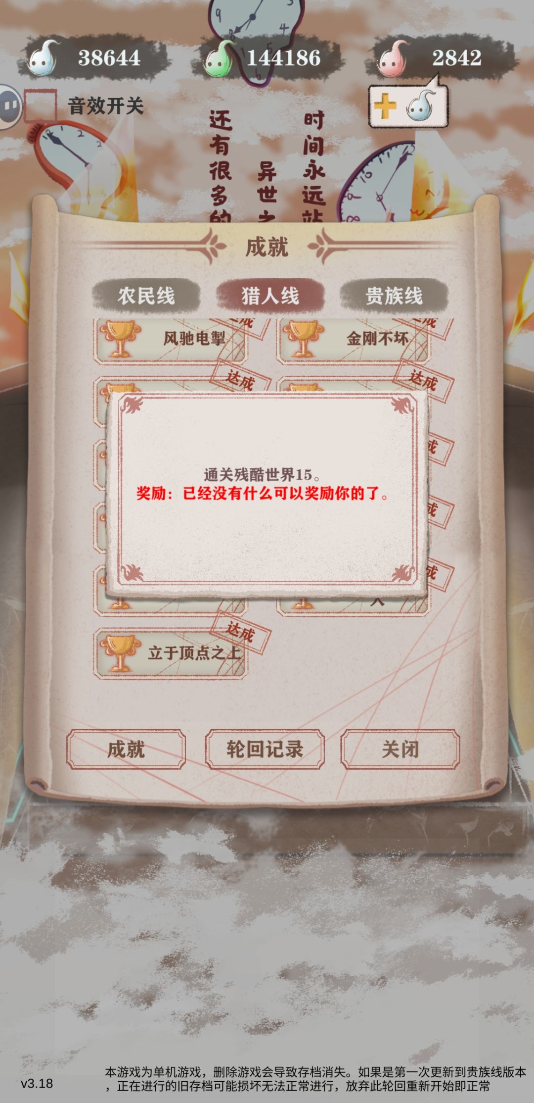 第一次玩猎人,推荐看猎人线攻略,这是第二局残一攻略。 开局前先看右上角广告支持下游戏创作者。 开局体力推荐75点,或者有+体力上限的天赋让体力>75,剩下的绿魂主加勇猛,剩下的平分在灵巧体质智力上。 天赋推荐,魔眼(核心)、鹰眼、弓之勇者、打工人、健身达人、谨慎 所以增加魅力的活动不参加,献祭技能在过了冒险地图三后学。 进入游戏, 一岁, 先睡觉,低概率做三次梦可出+4智力事件。 3岁 与父亲互动