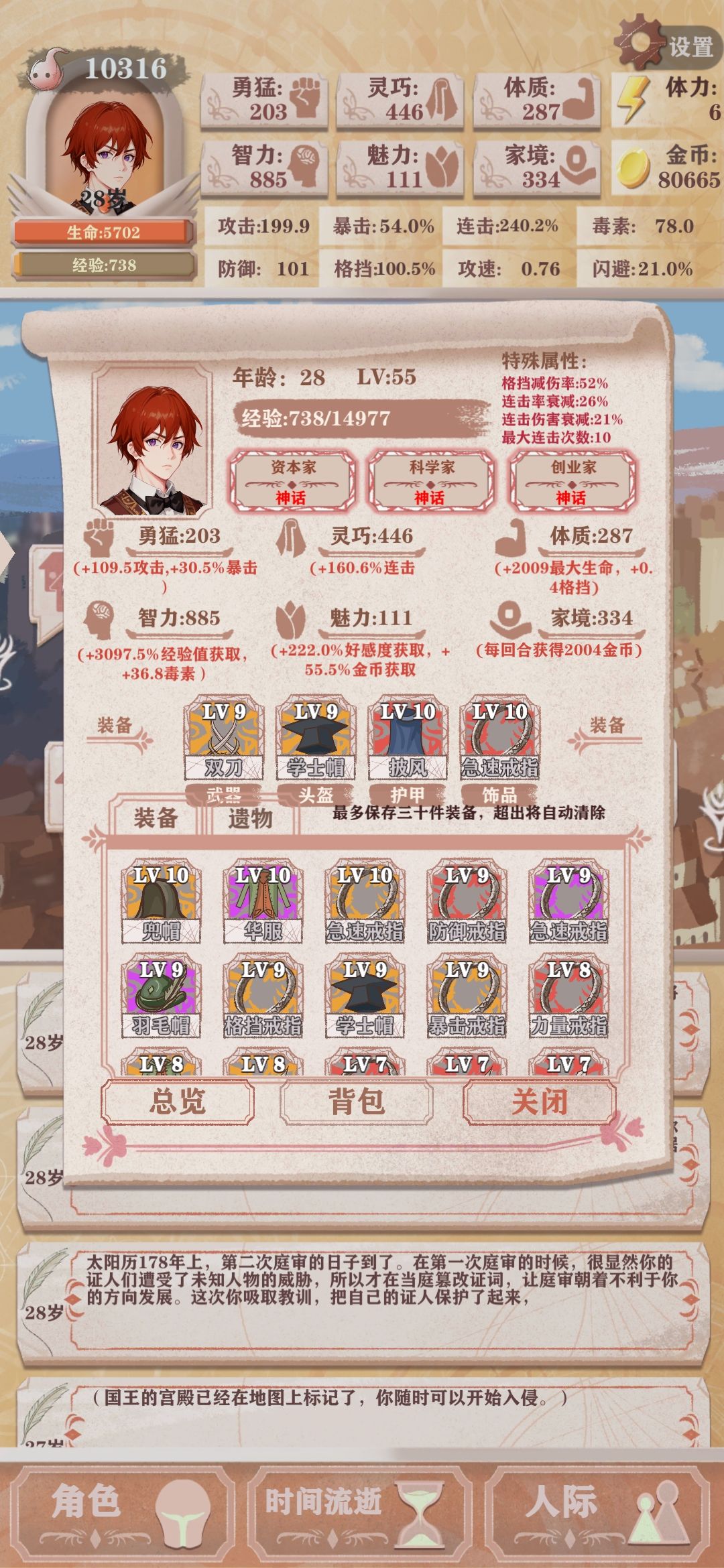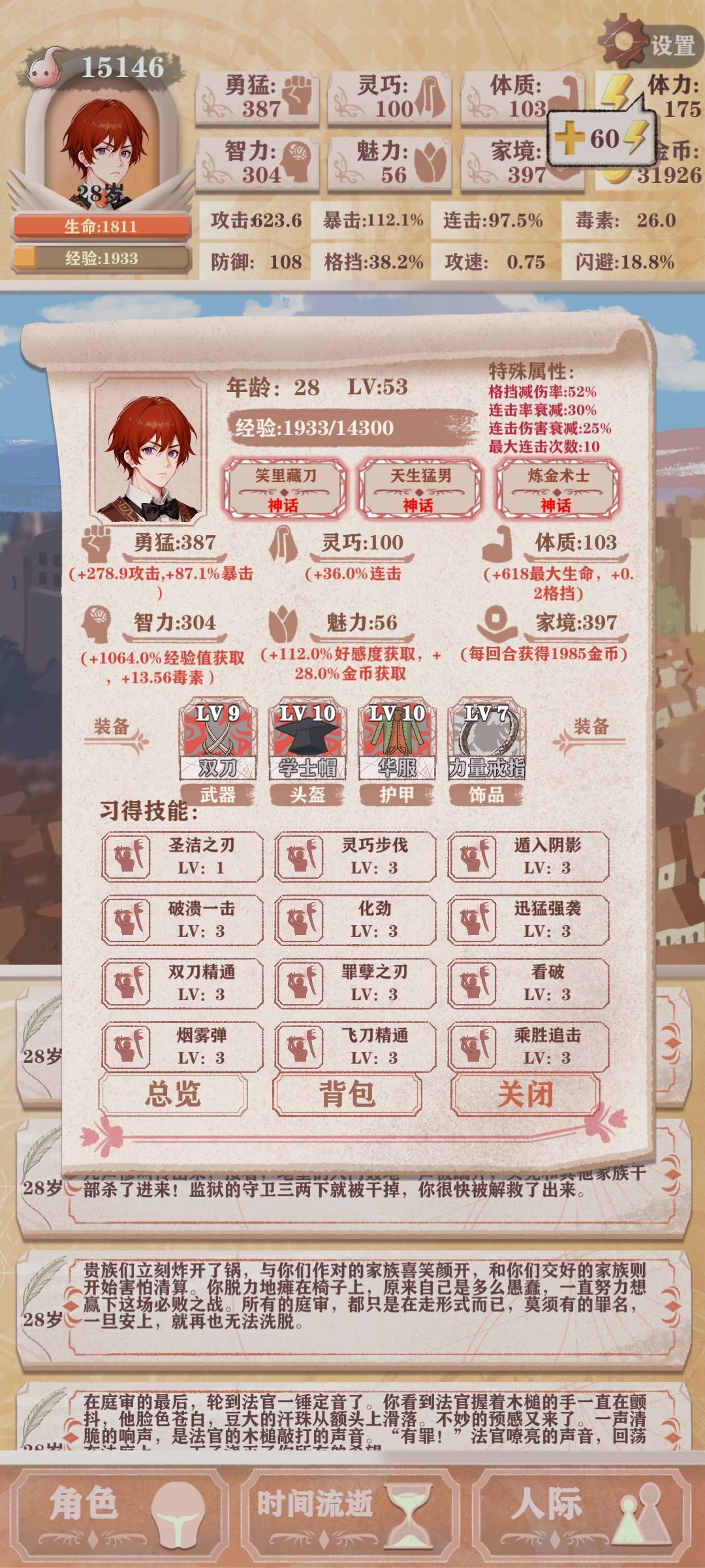 如果你已经打了两次贵族线的话,主角光环加体力上限,最好加到4级,体力很重要,后面体力用来走私货物攒钱和锻炼下本,体力不够就很尴尬了。剩下的可以用来加智力连击或者家境,其他属性可以随意,毕竟后面可以用钱买属性。 穷之勇者无敌!!!!健身达人赛高!!!什么隐形人和死亡回归等等看似有东西实则没啥大用,至于一击超人,因为后面的大多都是群体怪,且有隐身和造成失明以及格挡的怪都很克制这个,虽然伤害也非常爆表但