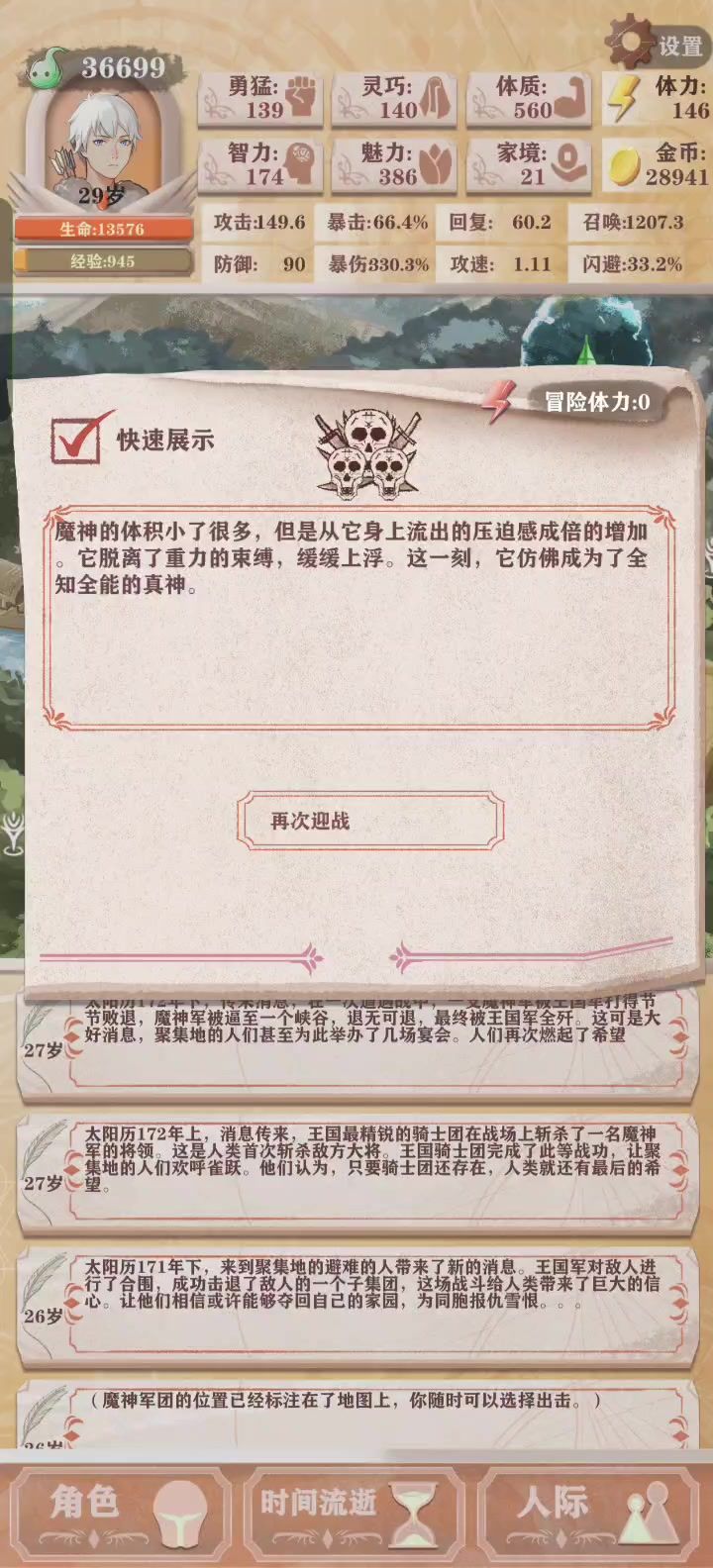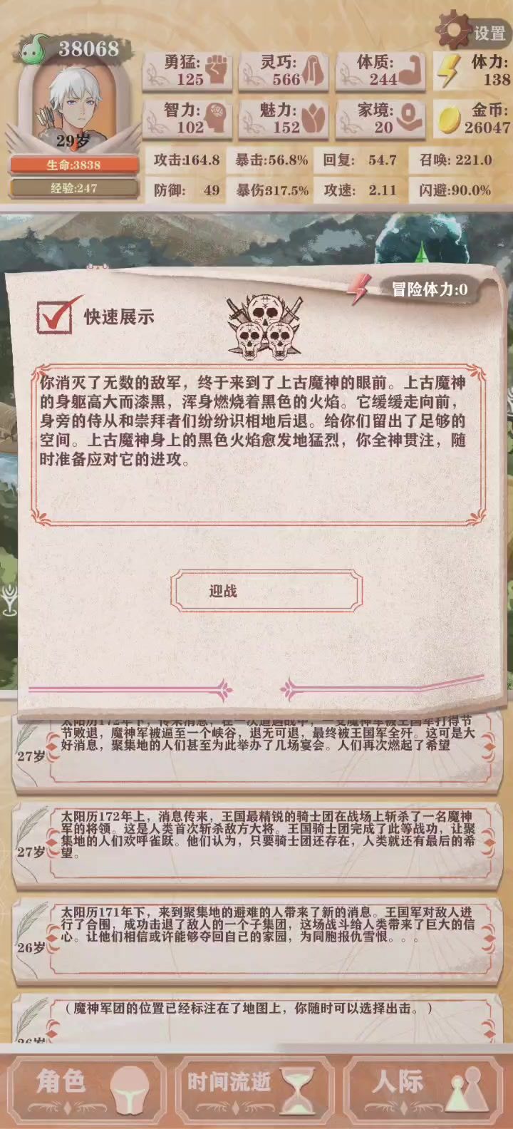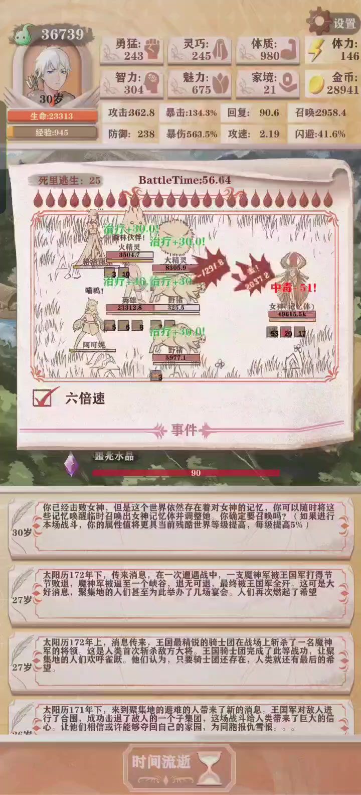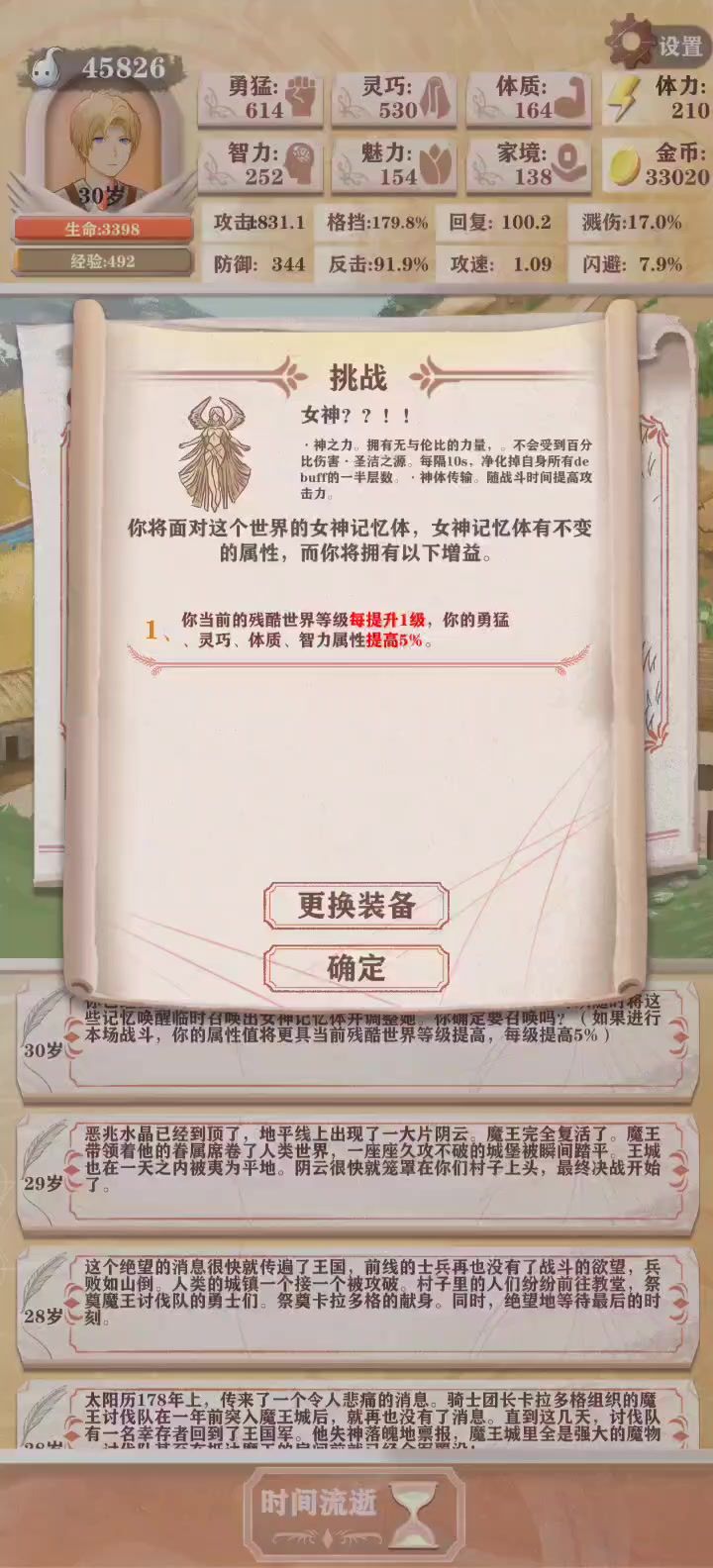 #异世轮回录 这次也是成功讨伐女神了,上次小一千的灵巧加上四百左右的勇猛打残8还是残10来着,天赋也是用刮痧一击创业,结果惨败被女神血虐。结合这次,我发现问题的关键就是前期发育太慢了,这次打完残13再回到残2,发现难度完全是下降了十倍,带上大爹般的主角光环,进去下本完全是切瓜砍菜,哪怕因为刮痧大师,前期也还是有四五十点的攻击力,打小怪基本都是一两下就秒了,而且怪a一下也就扣几点血基本都是保持满血通