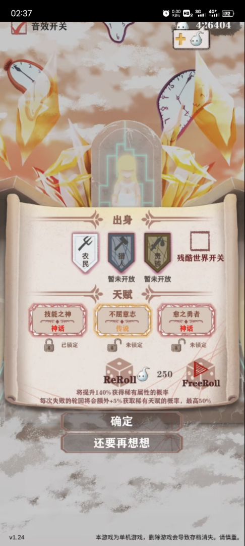 因为这游戏没有实质上的存档按钮,所以我一直都没sl过,后来虽然知道了,但这种游戏sl就没啥意思了,大概重开个10多次过了,其实难度还好,难顶的是随机性太强。我根据天赋把农民分了两个流派,一个是剑勇,一个是枪勇,剑勇主主动攻击,枪勇主反击,而由于随机性的原因经常在前期拿不到合适的技能和遗物导致暴毙,这边我建议想无sl的主角光环里面的死里逃生推荐至少3来增加容错率,其他的就点基础属性(除了智力)到5级
