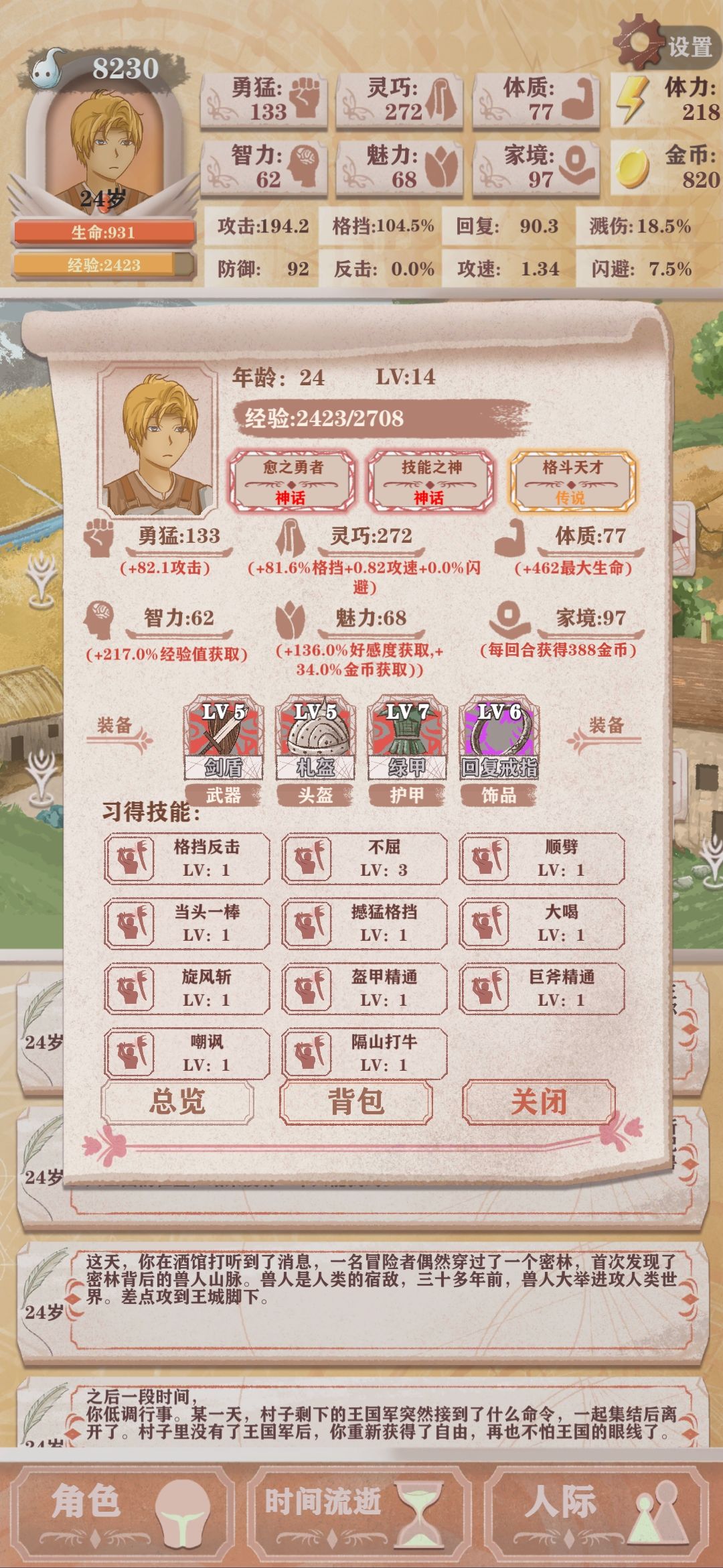 我上次说弃甲流玩不会,这次学着用压血流,别说,还是好使的,大概用压血流轮回了2-3次,最后这次通关了,图1是通关剑圣,14次逃生都没用到,一条命通关的,我截图的时候已经去买了健身课,所以图1勇猛要-6,图2是我通关魔王时的属性,最后剩了3条命,图4附上我的初始点数,大概80多万快90万魂了,不会策略的我只能当个莽夫[表情_捂脸哭] 就给大家一些关键点做参考吧 成长期加点,出生爬呀爬,然后看书,看完