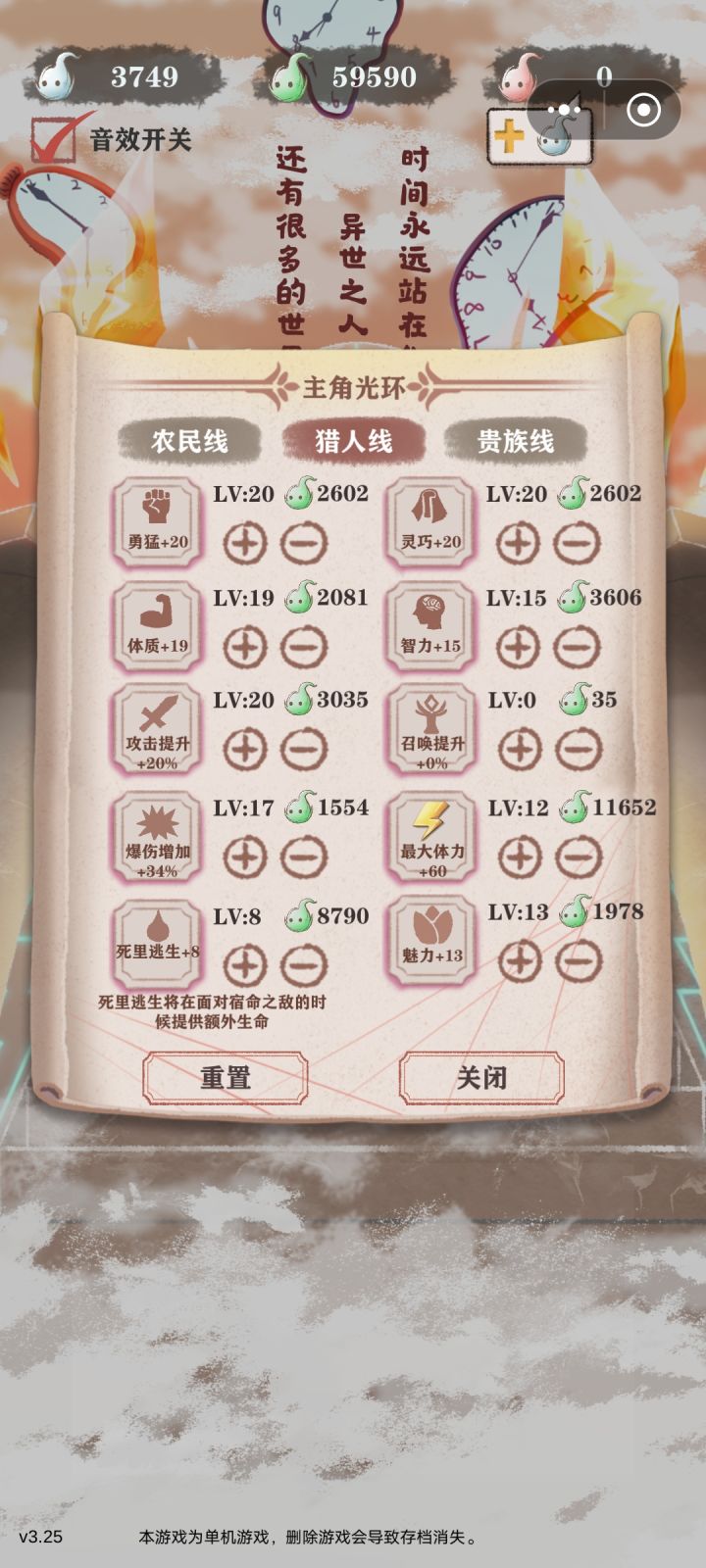 (残8)我前25天自认没什么问题(前15天打钱清商店,然后每天至少一勇猛一灵巧提升打猎概率,灵巧过百后每天两勇猛)每天都打一次勇猛工,翻译有就干,到了25天算了一下,发现如果继续买勇猛最后不可能攒到三万,基础数值和百分比提升权衡了一下觉得还是攒钱收益大一点(不知道这个决定对不对),鸟也不打了只打钱,勇猛也不买了,在最后一天正好攒够三万,不过感觉基础数值亏了很多,如果不攒钱勇猛破四百是没问题的,也想
