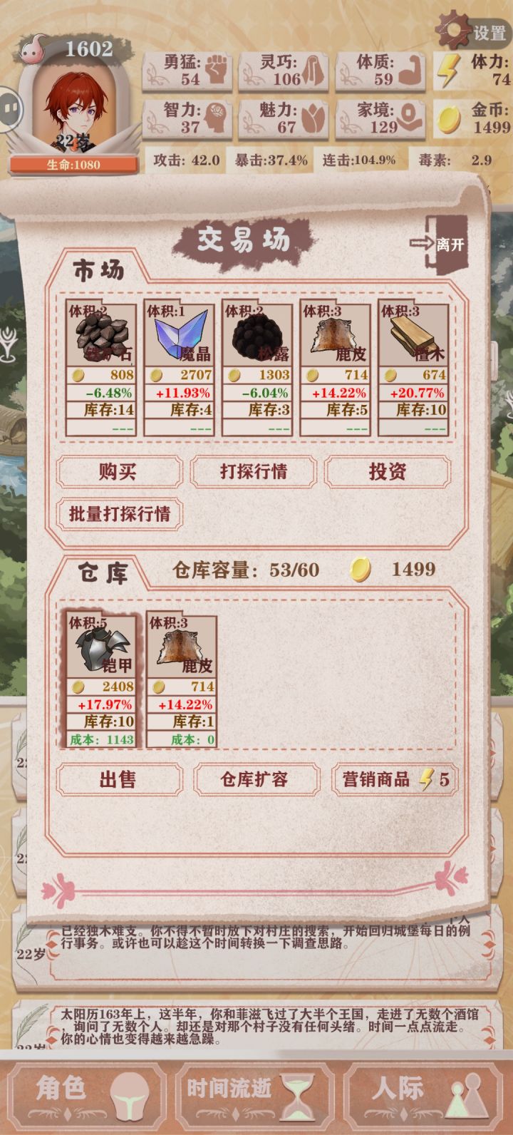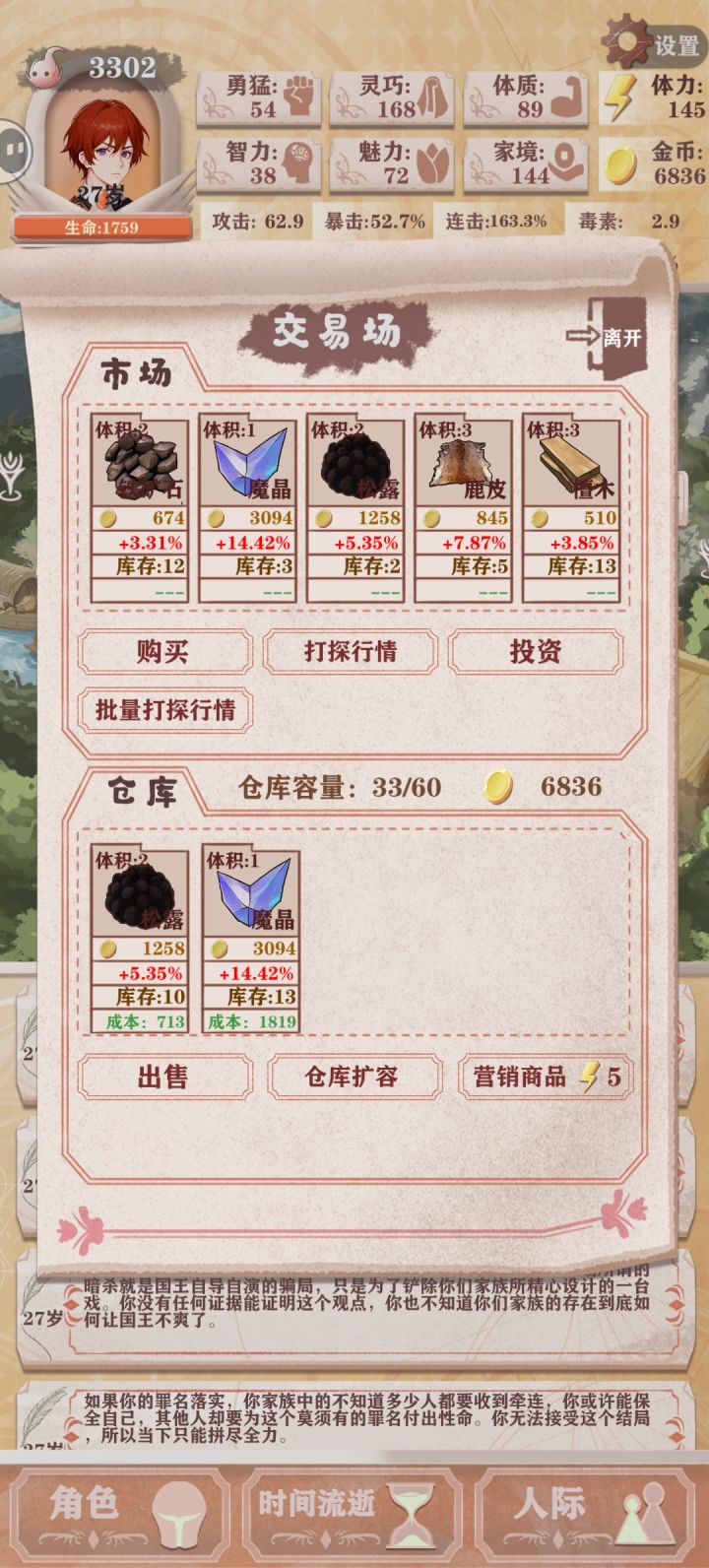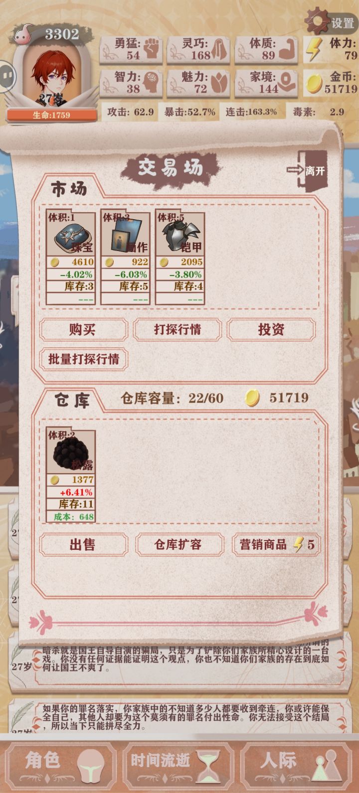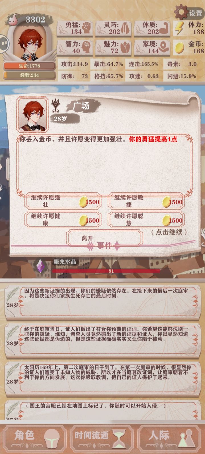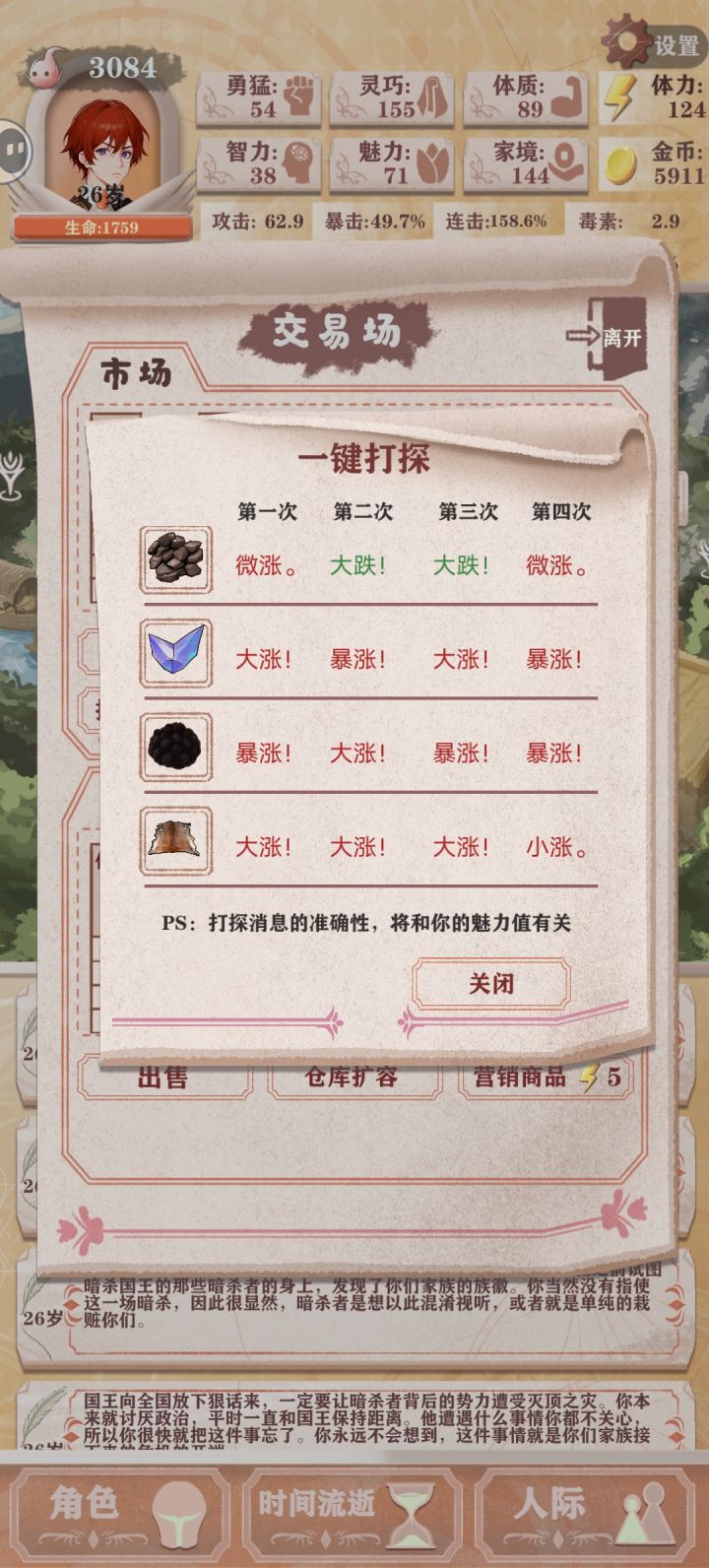(残8)我前25天自认没什么问题(前15天打钱清商店,然后每天至少一勇猛一灵巧提升打猎概率,灵巧过百后每天两勇猛)每天都打一次勇猛工,翻译有就干,到了25天算了一下,发现如果继续买勇猛最后不可能攒到三万,基础数值和百分比提升权衡了一下觉得还是攒钱收益大一点(不知道这个决定对不对),鸟也不打了只打钱,勇猛也不买了,在最后一天正好攒够三万,不过感觉基础数值亏了很多,如果不攒钱勇猛破四百是没问题的,也想