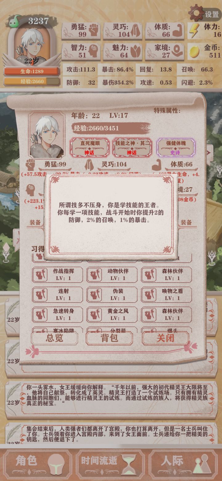 最后魔王那轮直接乱上装备了,还是稳稳过魔王,首先允许我向爆裂魔眼磕一个,我勒个超绝四阶爆啊其次恶兆三确实难过,甚至恶兆二也难过,我恶兆二暴击150%,恶兆三250%才过的,智力每轮25体三次拉满,勇猛射箭看剩余体力,射到40体就停,大头还是通过sl勇猛鸟来拿,勇猛千万不能低着重说说恶兆三,众所周知高残一刀流过了恶兆三就通关了。不点献祭,小动物挡刀确实有用,没点分裂箭,存多点钱,