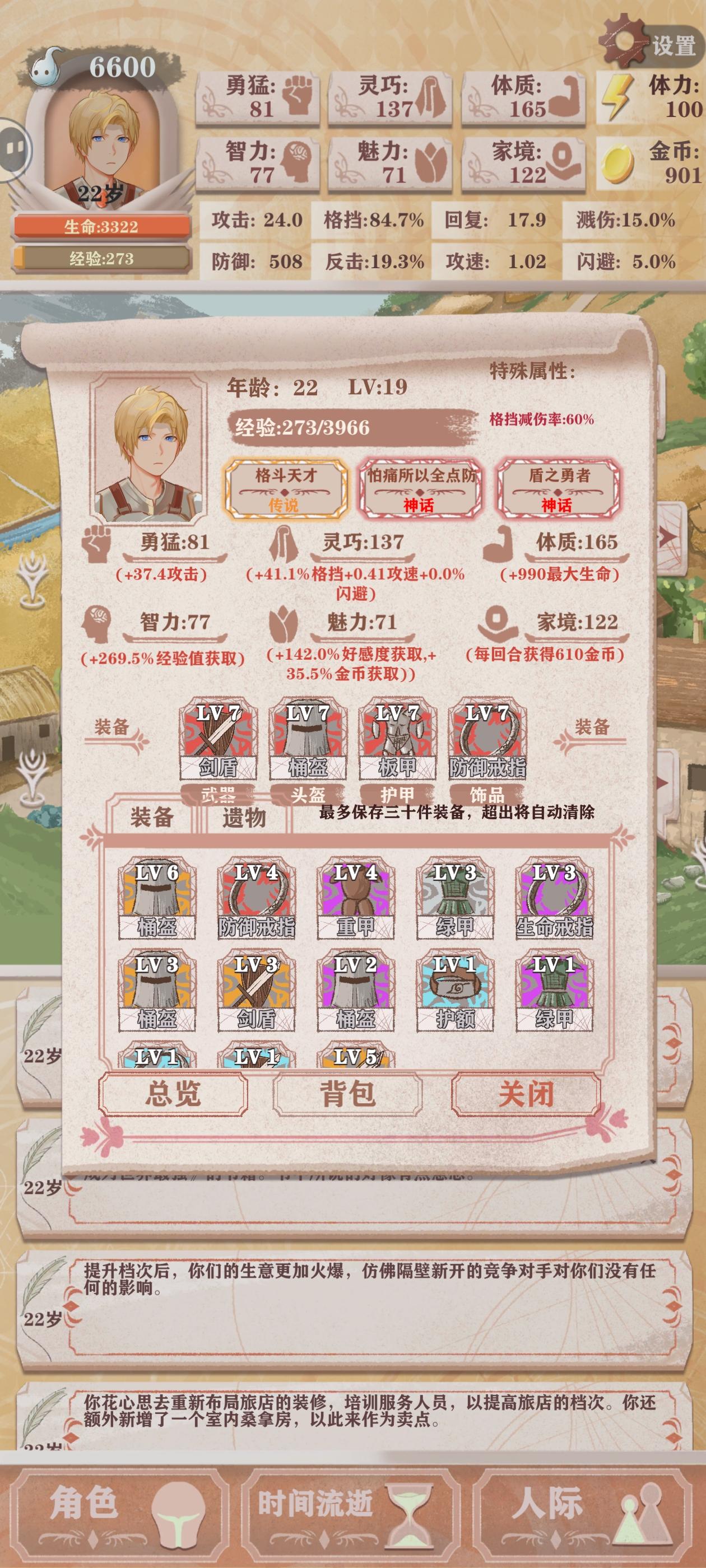 盾勇挺好玩的,无脑堆防御就行了,然后加体质!这是我最高的防御了500多,挺好的!伤害也不错,防御为伤害的遗物都拿了。质量也快7000了,所有有用的遗物都拿了!#游戏日常 血魔之盔是挺不错的,还有那个什么巨魔之所有秘境的boss全打了,反正农民真的比猎人好玩,因为经济稳定!我都没钓鱼,体质高了,打一次工钱也蛮高!不过上限是没猎人高的,那挺好的
