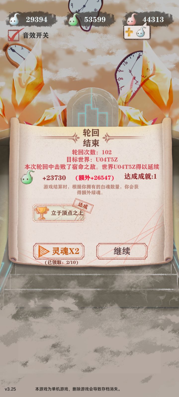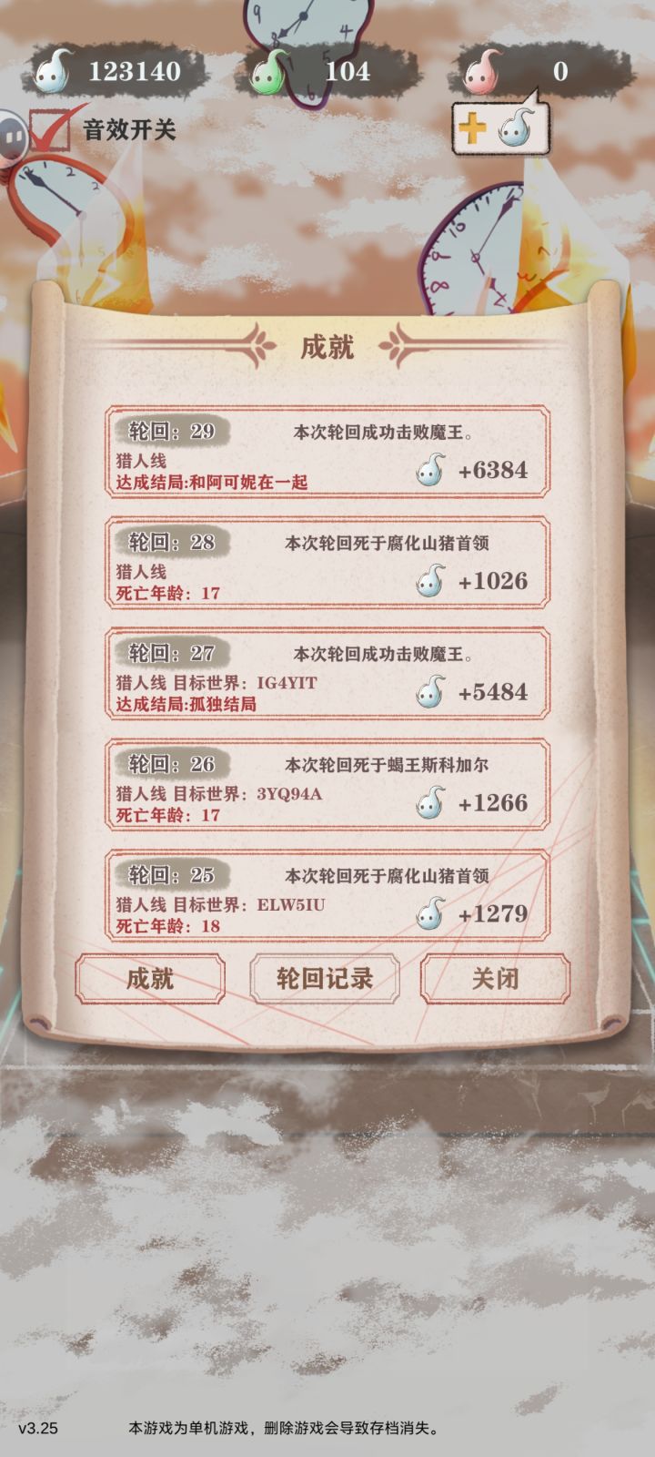 最后魔王那轮直接乱上装备了,还是稳稳过魔王,首先允许我向爆裂魔眼磕一个,我勒个超绝四阶爆啊其次恶兆三确实难过,甚至恶兆二也难过,我恶兆二暴击150%,恶兆三250%才过的,智力每轮25体三次拉满,勇猛射箭看剩余体力,射到40体就停,大头还是通过sl勇猛鸟来拿,勇猛千万不能低着重说说恶兆三,众所周知高残一刀流过了恶兆三就通关了。不点献祭,小动物挡刀确实有用,没点分裂箭,存多点钱,
