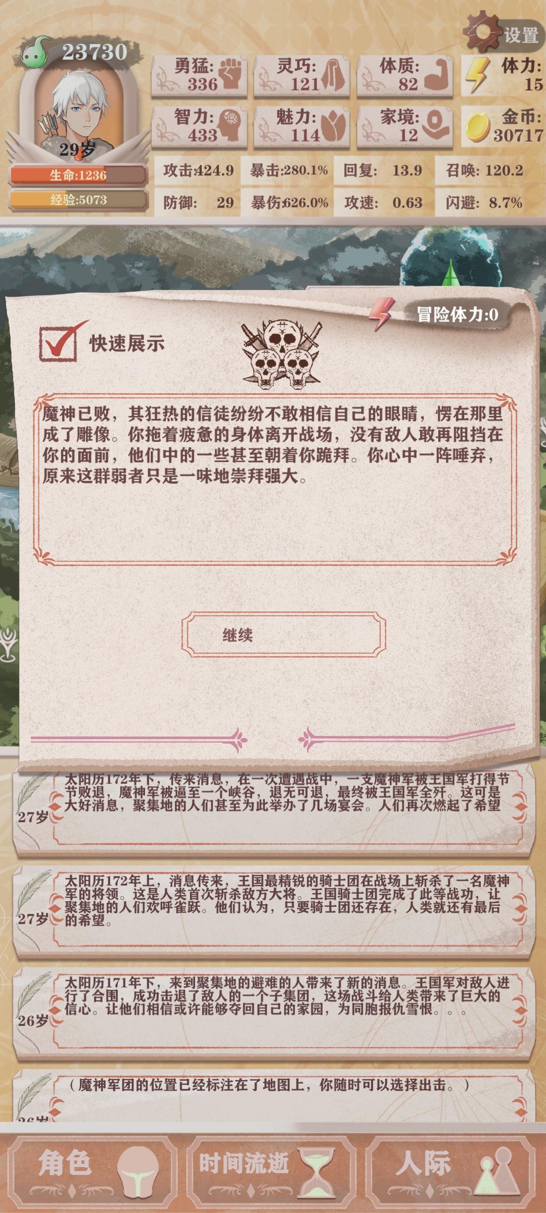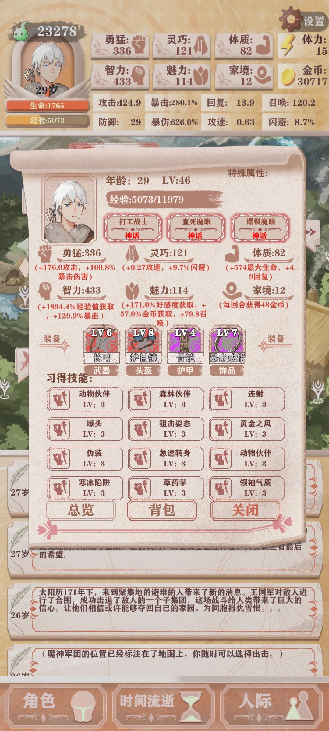 最后魔王那轮直接乱上装备了,还是稳稳过魔王,首先允许我向爆裂魔眼磕一个,我勒个超绝四阶爆啊其次恶兆三确实难过,甚至恶兆二也难过,我恶兆二暴击150%,恶兆三250%才过的,智力每轮25体三次拉满,勇猛射箭看剩余体力,射到40体就停,大头还是通过sl勇猛鸟来拿,勇猛千万不能低着重说说恶兆三,众所周知高残一刀流过了恶兆三就通关了。不点献祭,小动物挡刀确实有用,没点分裂箭,存多点钱,