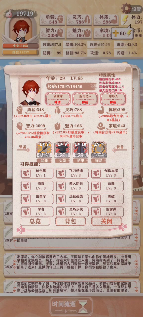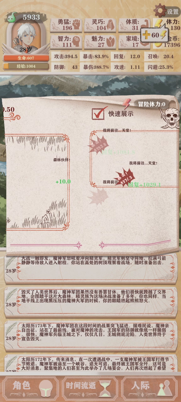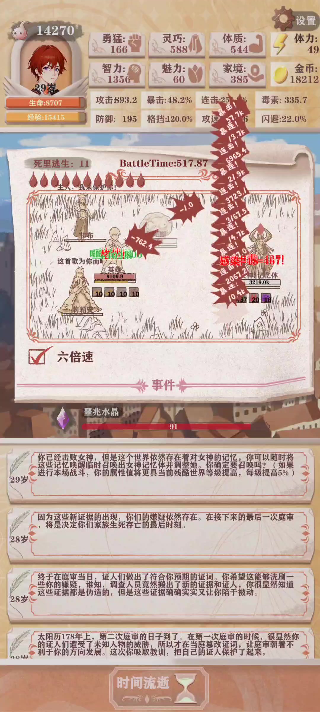 这局打了我三天,女神不能用常规的过关思路去打,无脑叠闪避的话,溢出的部分打女神完全没用,所以我不仅拿了甘露,最后几回合改主练体质,还刷了个防御戒和绿甲。事实证明我是正确的,女神只要不是连续命中两次基本打不掉死逃,有爹甲在一般也能回上来,如果叠纯闪的话我估计女神半血都磨不掉。但代价是打魔神更难了,腐化叠满只有85.7%的闪避,不过还是凹过去了。比起闪避,我觉得召唤更好打,久念佬这两天正在试,而一刀昨