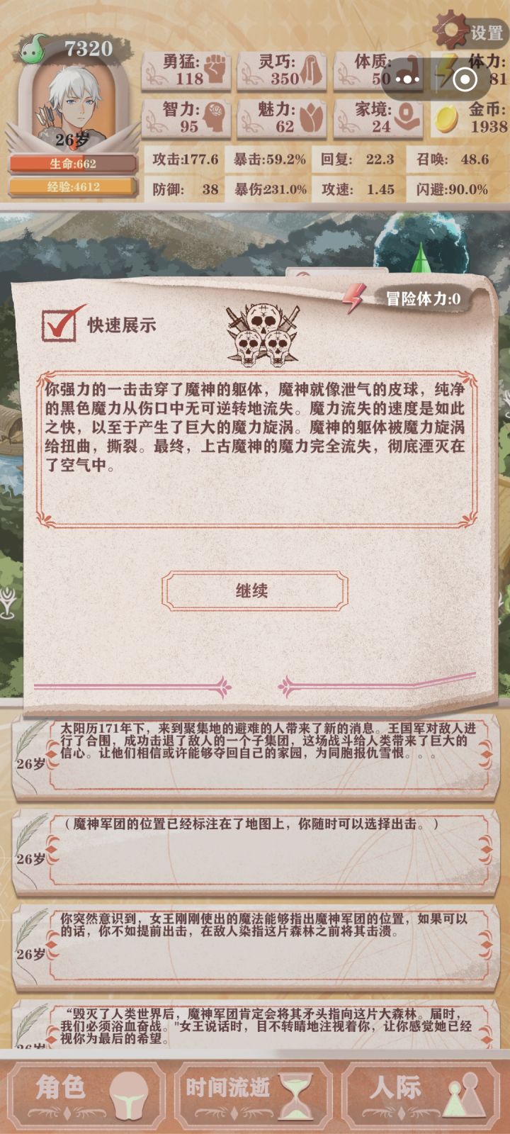 最后魔王那轮直接乱上装备了,还是稳稳过魔王,首先允许我向爆裂魔眼磕一个,我勒个超绝四阶爆啊其次恶兆三确实难过,甚至恶兆二也难过,我恶兆二暴击150%,恶兆三250%才过的,智力每轮25体三次拉满,勇猛射箭看剩余体力,射到40体就停,大头还是通过sl勇猛鸟来拿,勇猛千万不能低着重说说恶兆三,众所周知高残一刀流过了恶兆三就通关了。不点献祭,小动物挡刀确实有用,没点分裂箭,存多点钱,