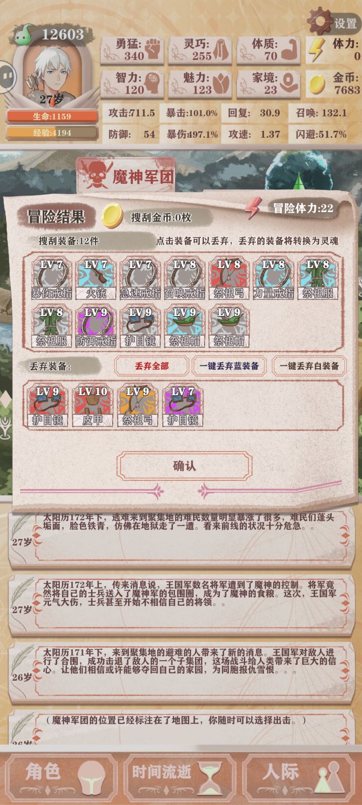 最后魔王那轮直接乱上装备了,还是稳稳过魔王,首先允许我向爆裂魔眼磕一个,我勒个超绝四阶爆啊其次恶兆三确实难过,甚至恶兆二也难过,我恶兆二暴击150%,恶兆三250%才过的,智力每轮25体三次拉满,勇猛射箭看剩余体力,射到40体就停,大头还是通过sl勇猛鸟来拿,勇猛千万不能低着重说说恶兆三,众所周知高残一刀流过了恶兆三就通关了。不点献祭,小动物挡刀确实有用,没点分裂箭,存多点钱,