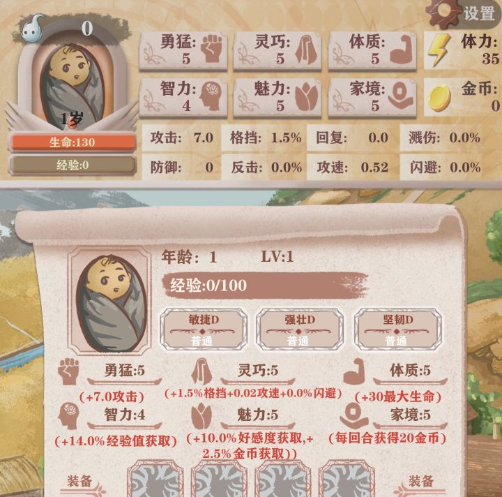 开局先点右上角看广告支持游戏开发,得绿魂,最大体力、力量、体质、灵巧、智力各+1,刚好用完广告给的绿魂。进入游戏,先点来左下角角色,我们可以看到勇猛+暴伤,灵巧+攻速、闪避,体质+恢复,智力+暴击,魅力+金币、召唤兽强度,家境相比农民线没有任何变化。我们可以看到,暴击和暴伤代替格挡和反击,也就是智力代替灵巧,成为猎人世界唯一可以叠满100%的属性,十分重要。1岁,点开树屋,可以选择爬来爬去