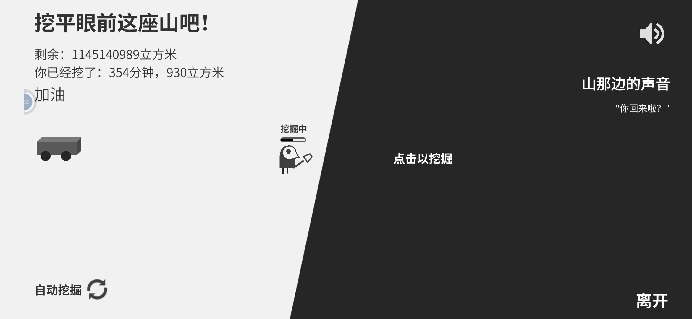 挖了很久(2667分钟即44小时多点,7604m³),还没有遇到彩蛋 不过即使这辈子都挖不完,我都不会卸载,很无聊的游戏,但是我觉得很有趣从开始到现在几乎都是自动挖掘,真的很慢,最开始以为每分钟可以挖3m³,一次睡前把它点到每分钟4m³的速度,醒来发现连每分钟3m³都不够😂很想告诉山那边的人,我不是小哑巴,他哼的歌我都有听,他说的每一句话我都有截屏留下,西西弗斯这个组合名字我很喜欢。真想和他见见,和他一起坐在蒲公英草地上聊天观雨睡大觉。或许这种“无聊”的游戏配无聊的我刚刚好吧最后恳求官方大大把删档和开始游戏分开些距离,我怕手残删档😂