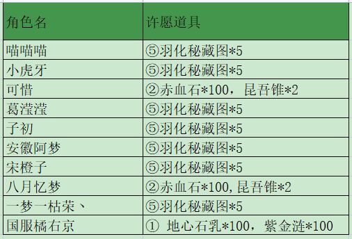 各位小伙伴:许愿福利丨想要什么道具就给什么道具,活动获奖名单如下,另外所有参与活动的玩家都有参与奖(秘藏图残卷上中下各*2),奖励将于今天通过邮件的形式发放,请大家注意查收,谢谢参与。