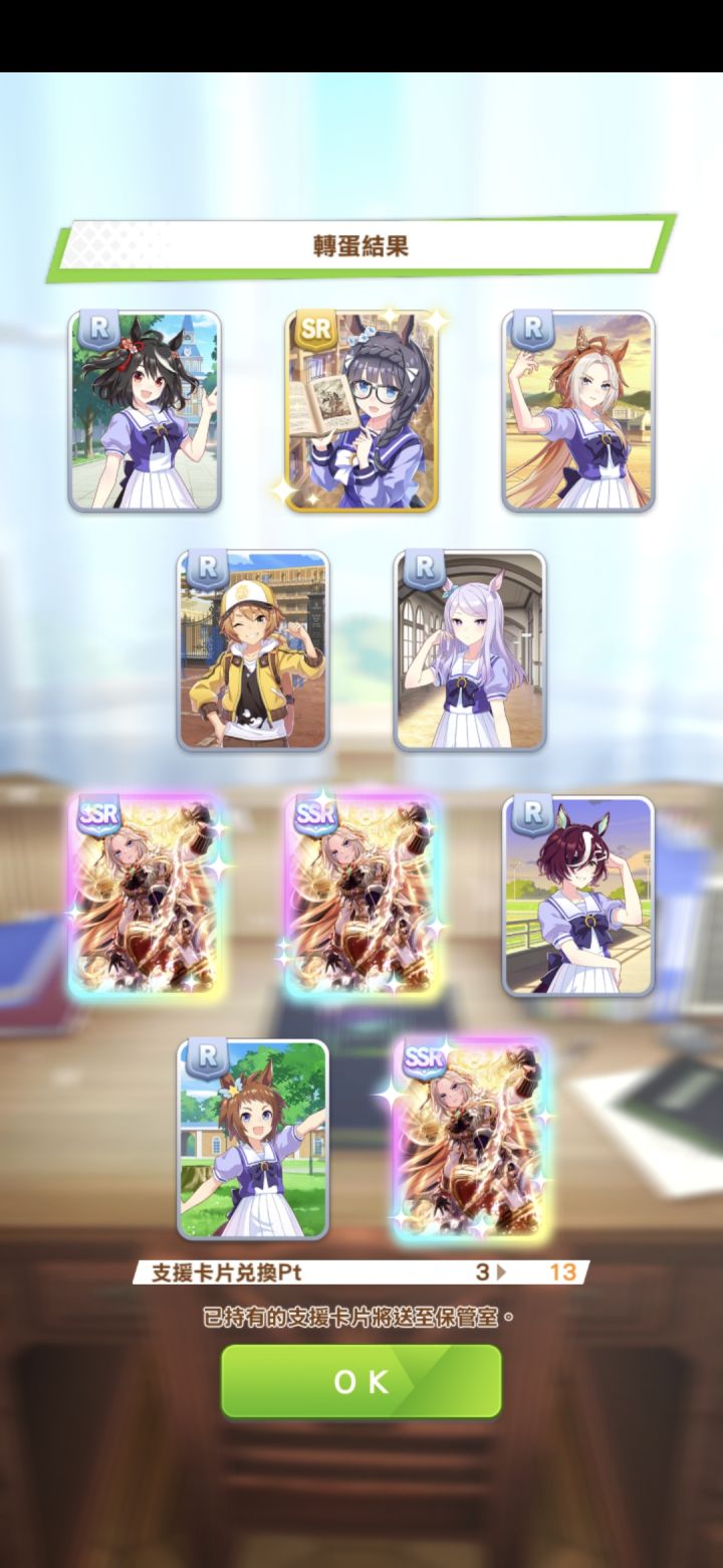顺带歪了已经有的好歌剧,和没有的原皮採珠,真是巧,没出up的採珠,出了个原皮,赚大了感觉。还养了个比较顺畅的ud7贵妇人,这都没有上UC,感觉已经很走运了呢,没办法,料理大成功次数多,合宿只有一次没彩,其他全有,我靠,也有可能是平时实在运气垃圾我都习惯了。