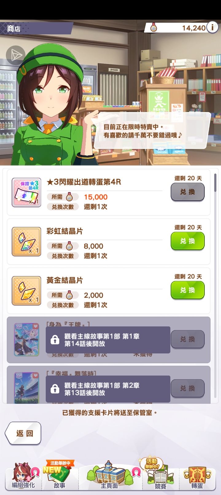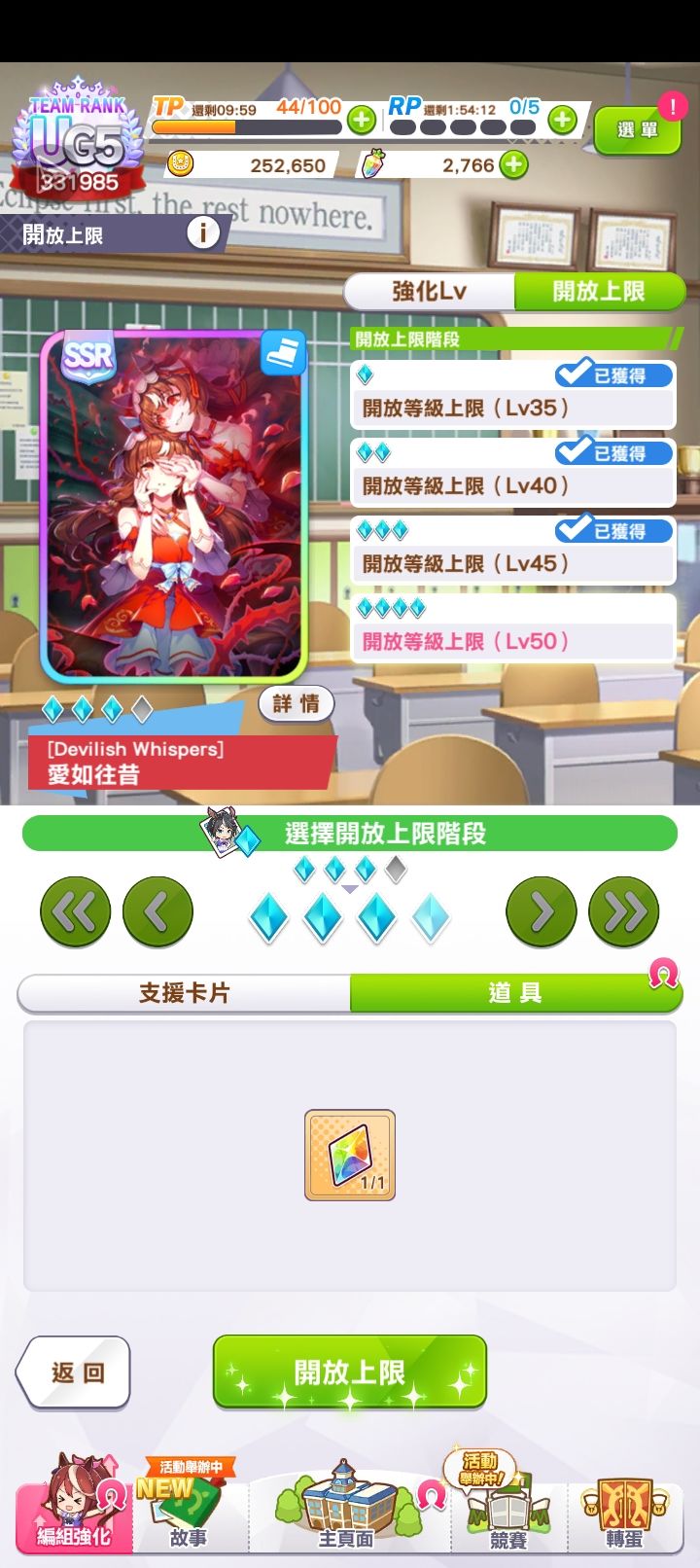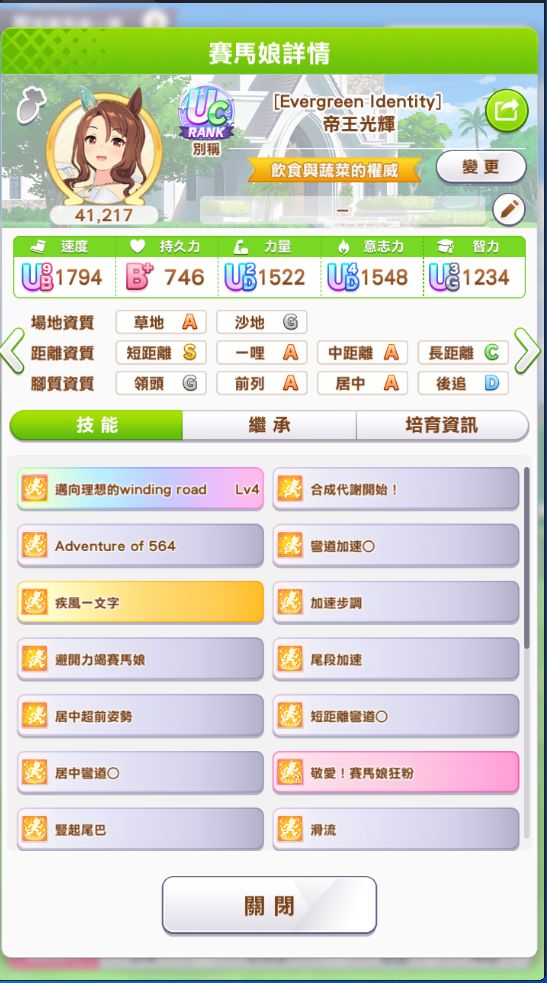 我第一只超4w分马娘,终于突破ud进入第一次进入uc了。第三年的合宿只有一回合菜,其余全部不仅没彩,人头都很少,不得已点了3回合的加20几的智力。这也能uc26.2.26:第二只UC马,花嫁光辉