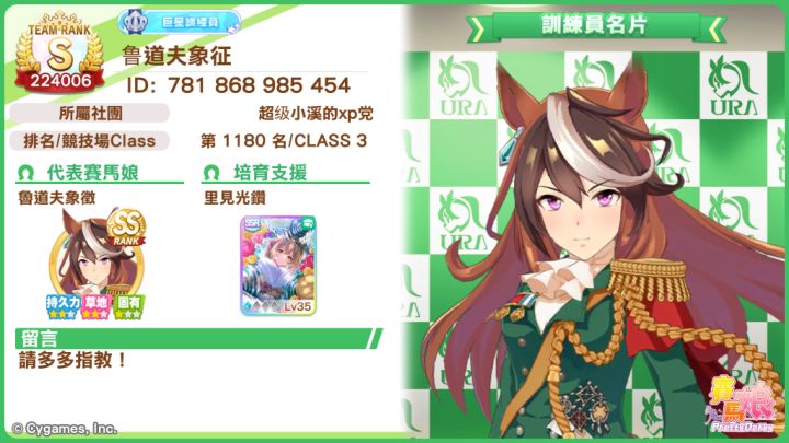 经过我的高强度训练(自认为),连续养了一个星期。终于啊,在今天下午两点四十分,哎,我的第一只SS马成功出炉。队伍等级也到了S,还破了我凯旋门的评价记录。之前看了一个视频,说我们卤豆腐是赛马娘界的牢九门,这句话我是不认同的。我们卤豆腐哪里牢了,明明很强的好吧,不要睁着眼睛瞎说,也就养废了十次八次什么的(小声)总之我们卤豆腐要战绩有战绩,要颜值有颜值,要幽默有冷笑话孩