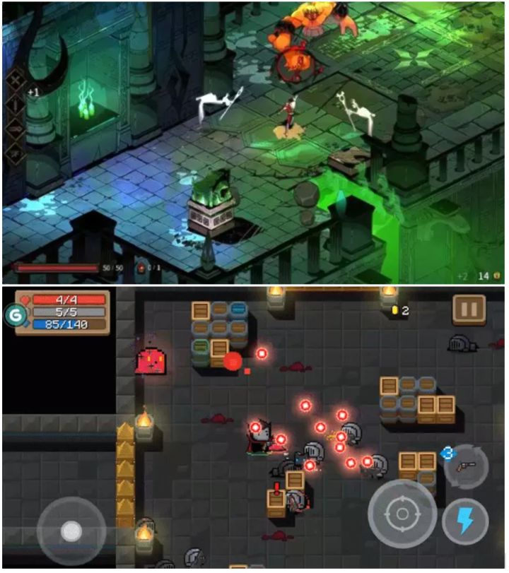 【浣熊不高兴】(简称浣熊)是bigcat制作,心动发行的rougelike,俯视角动作冒险游戏。rougelike品类近年来已成为手机游戏、独立游戏开发者们的心头好。pc上,有TGA勇夺最佳动作和最佳独立游戏的【哈迪斯】(Hades)。手机上,也有像素风的【元气骑士】【比特小队】等(图一展示)。于是,浣熊又准备了那些创新和特点,拿来吸引玩家,“拴住”玩家呢?