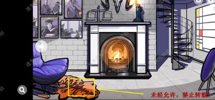 攻略作者:迷失攻略组-longma未经许可,禁止转载,侵权必究!第5关上攻略1.查看地上的老虎皮可获得案件线索。12.来到健身房,点击墙上的滑板,将每一个滑板都反过来,在滑板的背部找到方向线索,向右(上北下南,左西右东),向左,向下,向右。23.来到浴室,点击右边化妆品架子下的箱子,根据上面得到的方位线索(向右,向左,向下,向右),滑动箱子上的锁,打开箱子,在箱子的盖子上面获得【电池】。