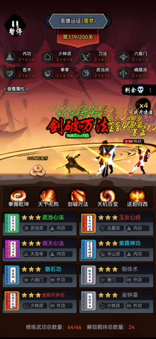 新版本内容: 1,修复网络不稳定时,看广告不给奖励,闯关后卡住等bug 2,上线预设阵容功能,提前预设后,选择武功时自动推荐 3,开放职业进阶功能 全职业武功达到一定等级,可消耗职业宝典进阶(副本和珍品商人处获得),进阶后职业羁绊效果加强,最高可提升50%的职业羁绊效果 4,角色增加新天赋技能 武林传说(ur):每升1级,暴击倍率永久+2%(不上阵也可生效); 一代宗师(ssr):每升1级,暴击倍