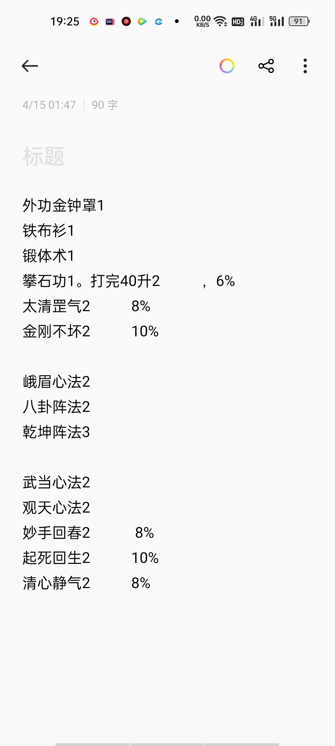 白色武学: 轻身术 金钟罩 罗汉拳法 锻体术 武当剑法 峨眉心法 绿色武学: 逍遥游 武当心法 丐帮心法 风雷阵法 板蓝根术 蓝色武学: 逍遥剑法 云龙身法 太清拳法 紫霞神功 千蛊万毒手 紫色武学: 岐黄之术 般若禅掌 修罗枪法 太清罡气 观天心法 红色武学: 乾坤阵法 玉女心经 起死回生 打狗棍法 无影身法 金刚不坏功 【羁绊】 6少林 6昆仑 2逍遥 2峨眉 2武当 2丐帮 2五毒 2天龙寺