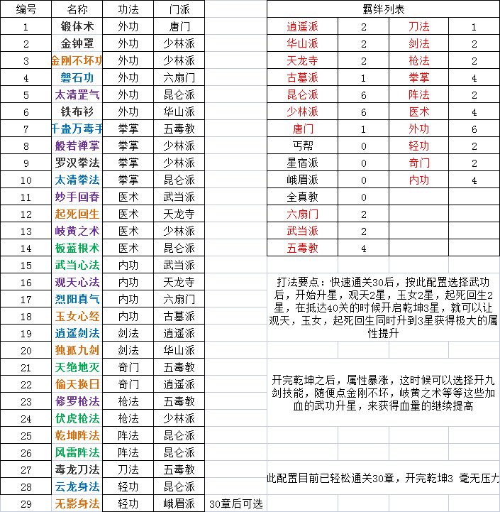 闲着没事整理了一下阵法和内功提升同类型武功的作用。红色的是需要手动升三星的白色的手动升二星绿色的手动升一星就够了注意提升顺序比如八卦阵法需要:八卦二,武当心法二,然后再乾坤三极限196关64门功法全三星