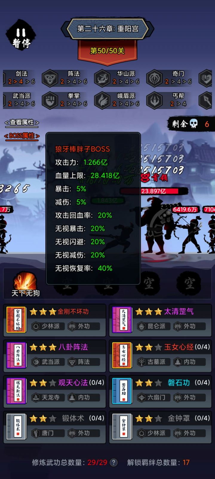 刚才有玩家贴出了37过关的视频,Boss血量1833亿左右,玩家血量74亿左右,每次伤害Boss55亿左右,玩家58亿(4逍遥就有36.5亿不知道是不是直接加最终伤害上的,如果不是那就更多了)按这样,青龙和白虎效果就差了,一个加7.4亿额外伤害按这个描述应该是加最终,一个加5.8亿护盾都是接近10%增减伤相反其他几个朱雀复活,如果次数可以叠加,搭配伤害流关卡就越过越稳,毕竟玩伤害流时Boss只能出一两刀玄武减伤加反伤各加25%幽莹减攻速50%,Boss小怪输出减50%,我谁都不怕了~(前提是扛得住一刀)烛照增伤100%当然我知道实战时肯定搭配不同的功法搭配不能简单这么算,还是希望作者做出来之后能在关卡内走一遍实测。不过就开服到现在的情况,个人是完全不担心,我感觉你们说是一个程序实际上三个人都挺懂的,不然怎么会每次更新出来都没什么BUG,有也很快就解决了,虽然程序不大,但是里面数值的道道可是一样的,不愧是打磨了好几年了,技术杠杠的,祝愿游戏越来越好
