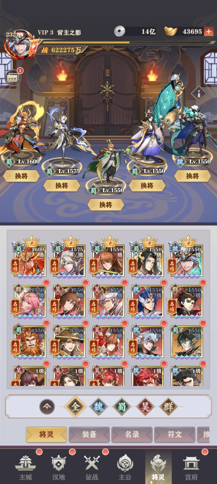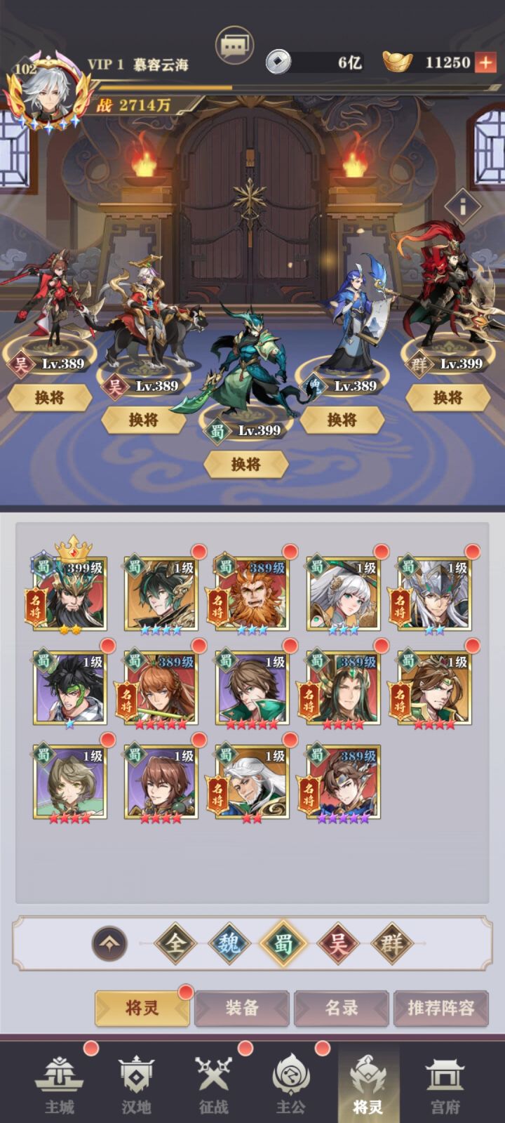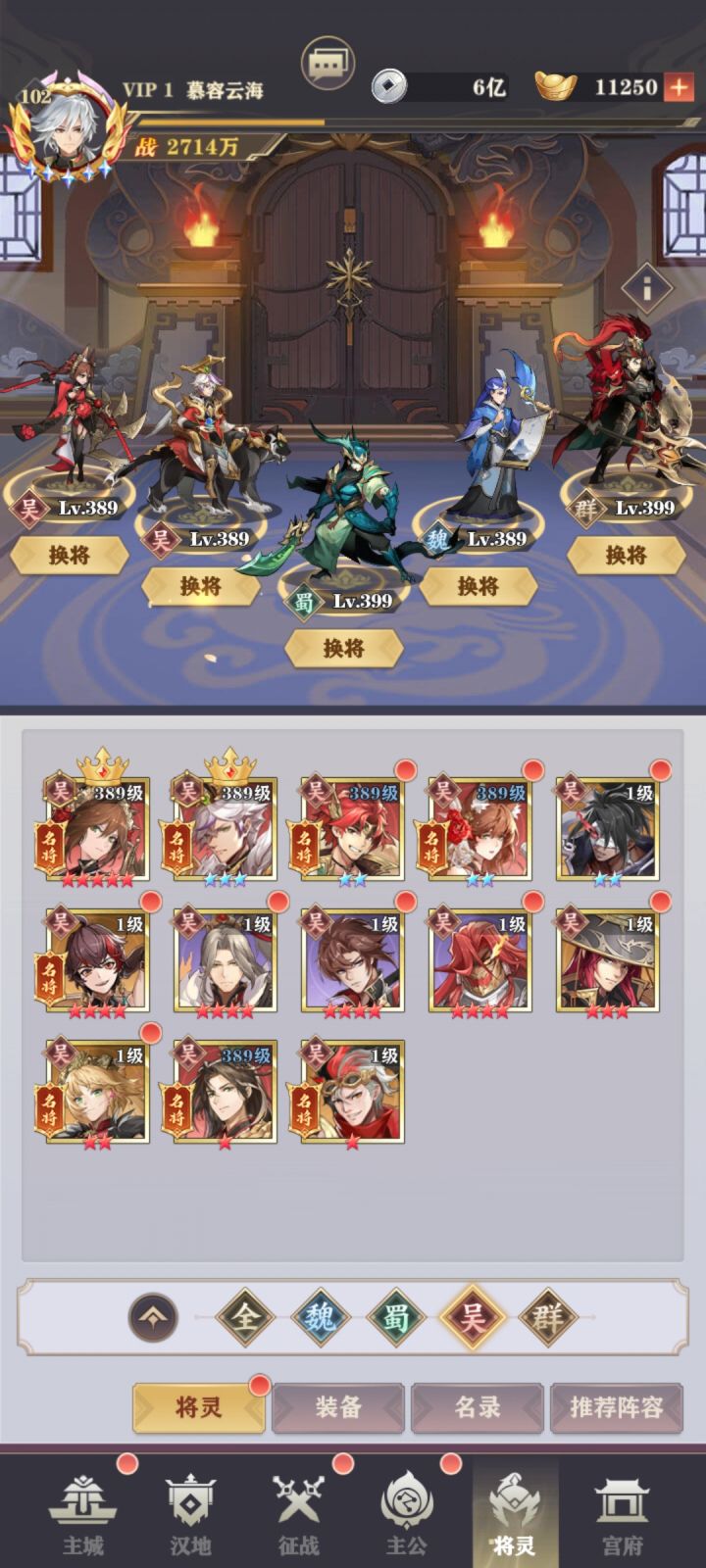 总52名武将,品级最高是红将,最大上阵五名,单个武将有升级、升星、装备几条养成线,天赋和技能随着星级而自动提升,是很常规的数值卡牌养成。主公和官邸功能开启较晚,其中应该也包含一定养成内容。