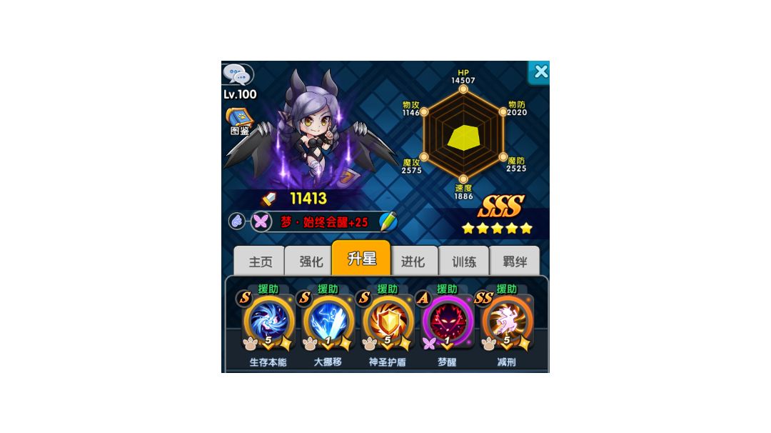 首先 我再次说明一个机制 援助技能一回合只能触发其中一个 ps: 如果我触发了龙魂 那这回合我就无法触发活力荆棘 所以我们需要将最好的技能概率最大化 目前版本最通用配置如下图 简单说就是99%关卡的爬塔援助队伍 !!!并不需要升⭐ 升星学会废物技能 影响概率 千万不要 乱升星 升星反而会变弱 下文有5★的配置 至少练两个队 比较好 图中一级的技能 就是别升级 故意降低触发概率 千万别升级!!