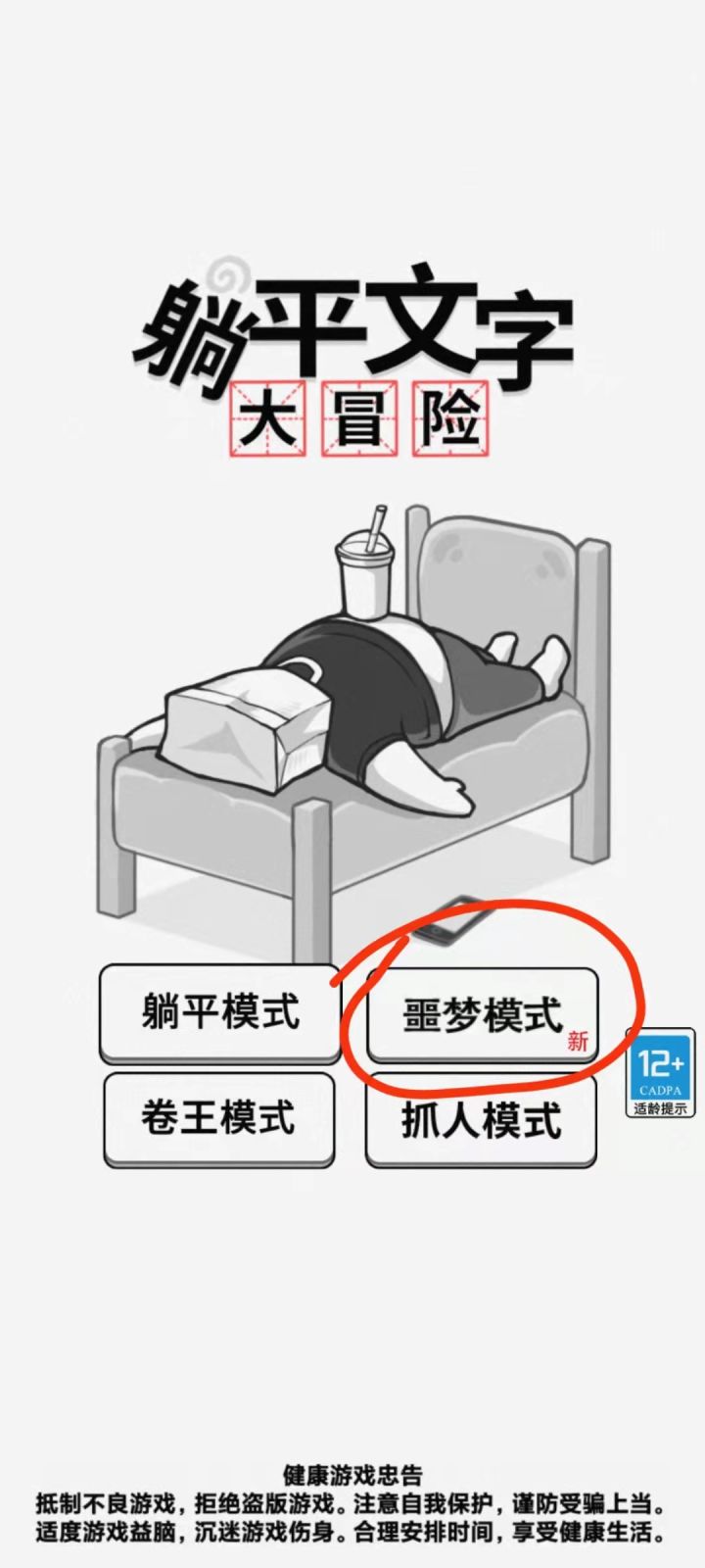 躺平文字大冒险-版本更新更新时间:2022/3/17更新内容:新增噩梦模式,修复闪退。