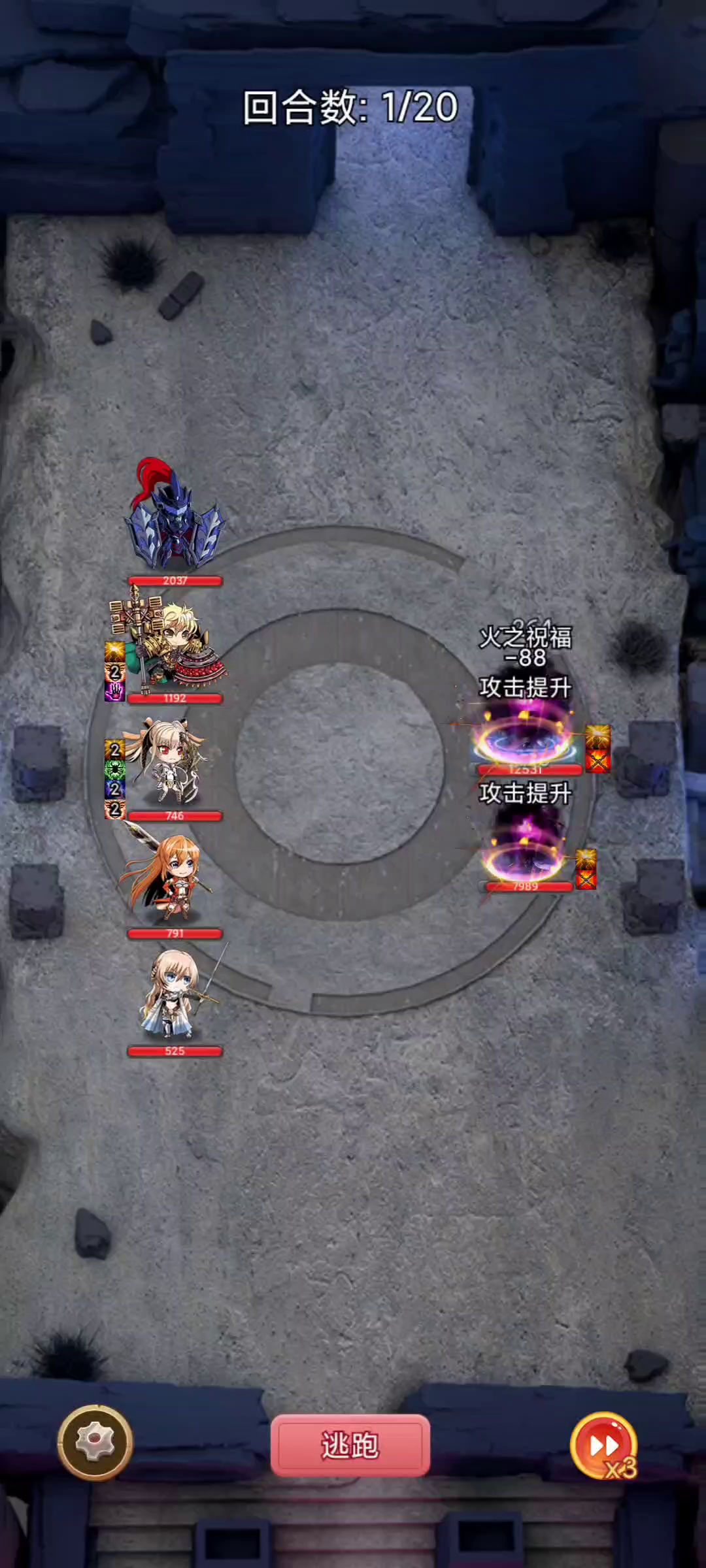 遗迹20层,是2个稻草人,一个物抗99%,一个魔抗99%。13回合后会有毁天灭地的陨石。想过此关就是13回合前杀死。跟减伤叠加叠减机制一样,过这关就是要输出,加深伤害,降低减伤。选人,火男,刺客。然后全体最大输出就行,修女什么的就不要了这关。