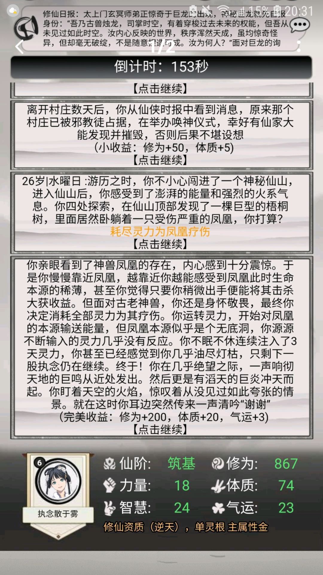 结果:气运+1,修为+15。