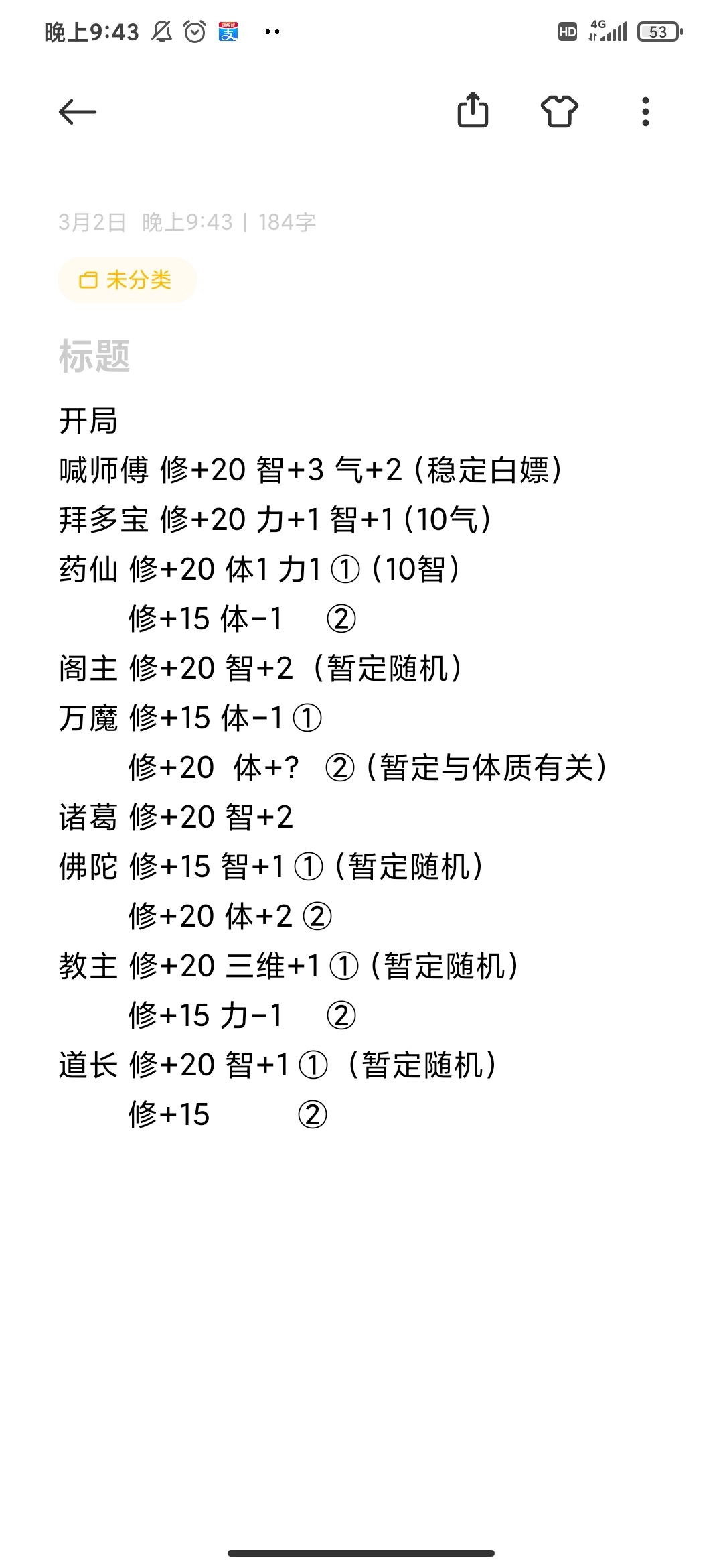 1.无想的一刀:①进入前提,气运≥12,修为≥2500,体和智都至少>30,力>50(死亡率很高) ②灵根有金,力≥60,智和体≥20。 (②是由玩家“怒在胸中”提供)(大人,时代变了,已经不是稳拿了,死亡率中。) ③灵根为双,三维≥55,运气≥12,目前成功率100%。(灵根为单,符合这个条件还选择的可能会没掉。) ④修为≥2500,任意一属性>120,其他两维≥30,目前成功率100%。(单,杂) ⑤力≥30,气运越接近30概率越高,欧皇の选择。 (每次用双都达不到这个条件,如果达到可以试一下,不过我认为双最好用方案三。) 2.跳崖:①直接跳:四维属性的和>185且气运必须>10(成功率>失败率) ②直接跳:体≥50,气运≥20(看个人运气吧,想测自己是不是欧皇的可以试一下。) ③直接跳:体≥50,智≥20,10<气运<20,越接近24成功率越大。 ④计算距离,智慧≥145。 (这么难达成的东西,干脆不要跳崖。) 3.死亡笔记如何写自己的名字不会死亡且正面收益?(还不如直接搞别人) 答:①智力或力量或运气>20且体质必须>15 (特别注意,体质不能算到前面去!) ②仅一个属性≥20并且其他三个<15。(当那个属性为运气时,改为运气≥15并且他三个<15) 结果:气运+1,修为+15。 4.如何救/杀凤凰? 答:①杀,力量≥41(不推荐,杀了气运会减3,加的属性也一般。) ②救,体质>50且气运≥20。(有失败,有成功。) ③救,体质>60。(只要属性差不要太大,几乎都成功。) 5.河神那 答 :①20力且20智拿金剑。(有些死亡率) ②杂灵根,25力且体智双15且运气≥15全拿。 ③任意两项属性(包括运气)≥20且最大属性与最小属性的差不能>10(最小属性包括运气)稳全拿。 6.如何杀大蛇? 答:①力量≥850且体质≥500且烧火杀蛇。 ②力量≥900且体质≥500且智≥350进洞杀蛇 ③智力≥?且体质≥500烧火杀蛇。 7.天道法则 答:①靠近,修为42500。 ②扩大,修为45000 。 ③不到42500选放弃,修为越接近42500几率越大。 8.轮回宫殿 答:选②(必死) 选别的就无了,不过这也是最大收益。 9.大哥哥 答:换剑是最大收益。 10.雷劫 答:①第一道雷:1.气运越高,概率越大。(即使你选择的属性不满足4500,气运高的话,也有概率成功,目测是气运≥36就无视属性满不满足) 2.5200你选的属性≥你选的属性≥4500你选的属性,中等概率成功。(试了一下,成功率估计是40%~65%(这是比较综合的,欧皇随便) 3.你选的属性≥5200,概率大幅度提升,比5200越高,概率越大。(成功率好像不能达到100%,还是看个人运气或游戏气运≥36) ②第二道雷,17.5万修为。 ③第三道雷:1.36运气。 2.当前面两道雷通过时,即使运气不足,也可以过,但不会解锁隐藏成就。 11.比蒙如何杀? 答:力量≥60 12.你为什么觉得救凤凰需要修为? 答:根据剧情,可以看出官方在提醒我们。 灵力=修为,执念=智力,因为输入了三天三夜的灵力,所以体质自然也要好一下相同点,就可以得出结论。 (现在来看,好像与修为无关了,就当娱乐了) 14.烛龙如何杀/告诉不死 答:①杀,力≥65,运气≥20。 ②告,(有了大概的方向,但是想在测试几遍,在等等,马上就弄完了。) 15.如何不被魔化大师兄杀死? 答:①打,力≥3000且体≥3000。 ②话疗,智≥?体≥?(感谢力修大佬“守候着”) ③被动防御,智≥?且体≥? ④气运就是最牛的,气运≥36,不管选哪个都能活,直接无视属性判定条件。 17.(消失的13) 答:16和12还有13的发现,是因为我是剧情党和分析党,习惯拿剧情来发现规律,如果官方没有把剧情和判定联合起来,请轻骂。(后面四张图片,偏娱乐,可看可不看。) 18. 我已经退游十天啦!(3.30)攻略估计如果不是游戏重大更新,我是不会来更新了。希望在我走之后,这个游戏会出现更多优质攻略大佬,慢慢填补这个帖子的空缺吧。