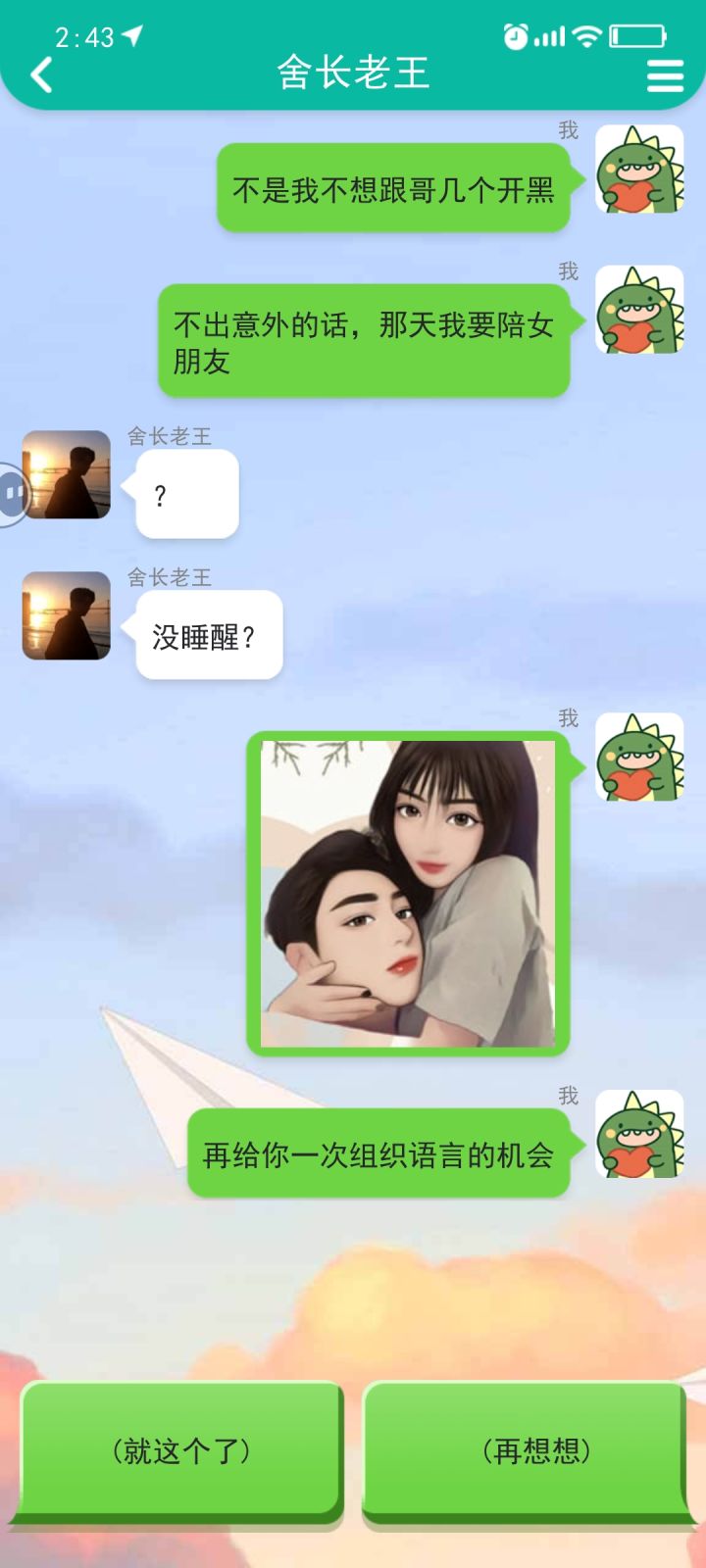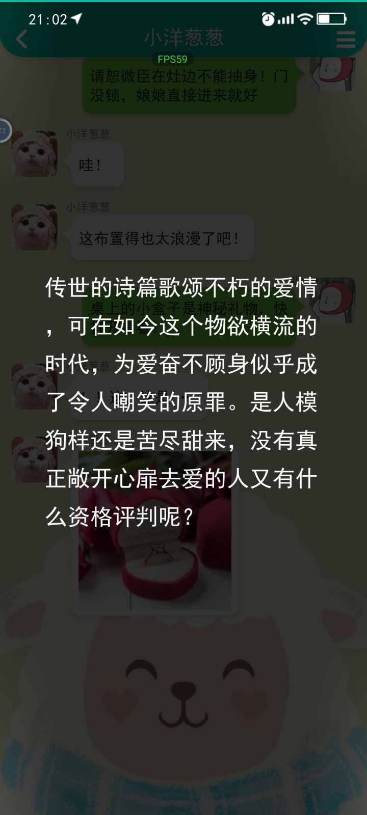 一下午把这个游戏玩通关了,看的广告有一些但不算多,开始我以为这种游戏就是聊天,当舔🐶的过程,实际上并不是。它讲述了一个男生和一个女生从谈恋爱到最终修成正果所经历的种种困难,他们都没有放弃,双方的坚持才能有最终美丽的结局,挺有意义的。(开始讲细节噜,有大量剧透!)