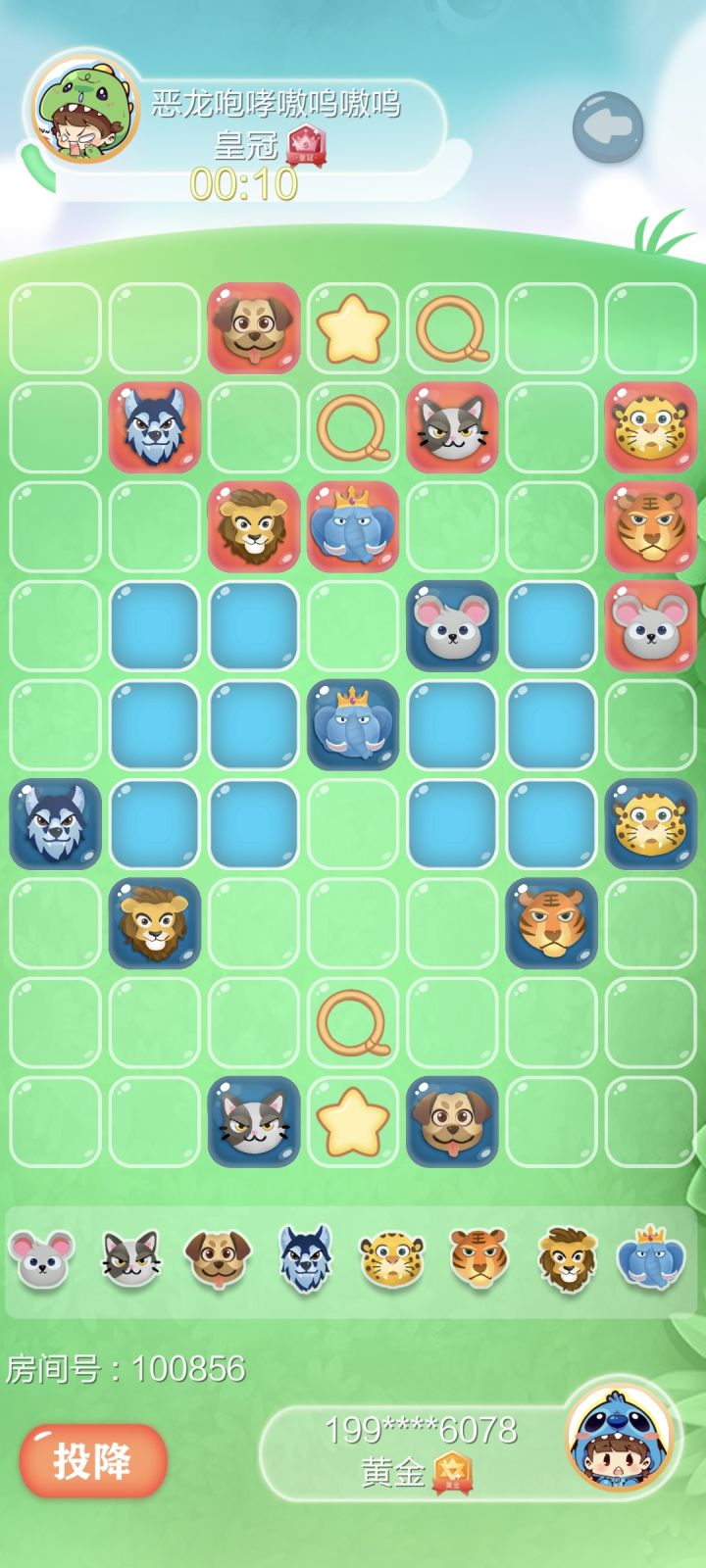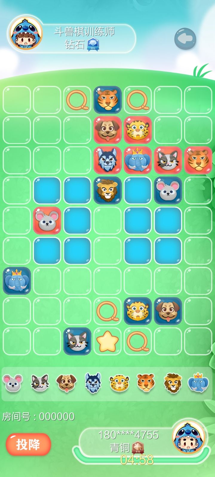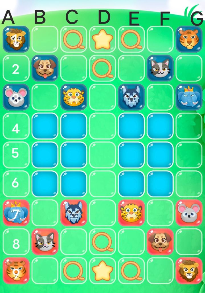 前言本攻略适用于斗兽棋入门一段时间的中级玩家,主要介绍几个斗兽棋行棋的兵家必争之地,利用好这些要道可以帮助玩家更好的走出优势。给下图标号方便讲解,红方走棋用字母开头,蓝方走棋用数字开头。第一步棋红方第一步棋,最佳应该走G6鼠,一步三用,未来可以进入河中,也可威胁对方象,还能给狮子腾出位置行动。其他走法如G8狮,B7象,E8豹等均不错,但都没有G6鼠更加有进攻积极性。第一要道D6和4D分